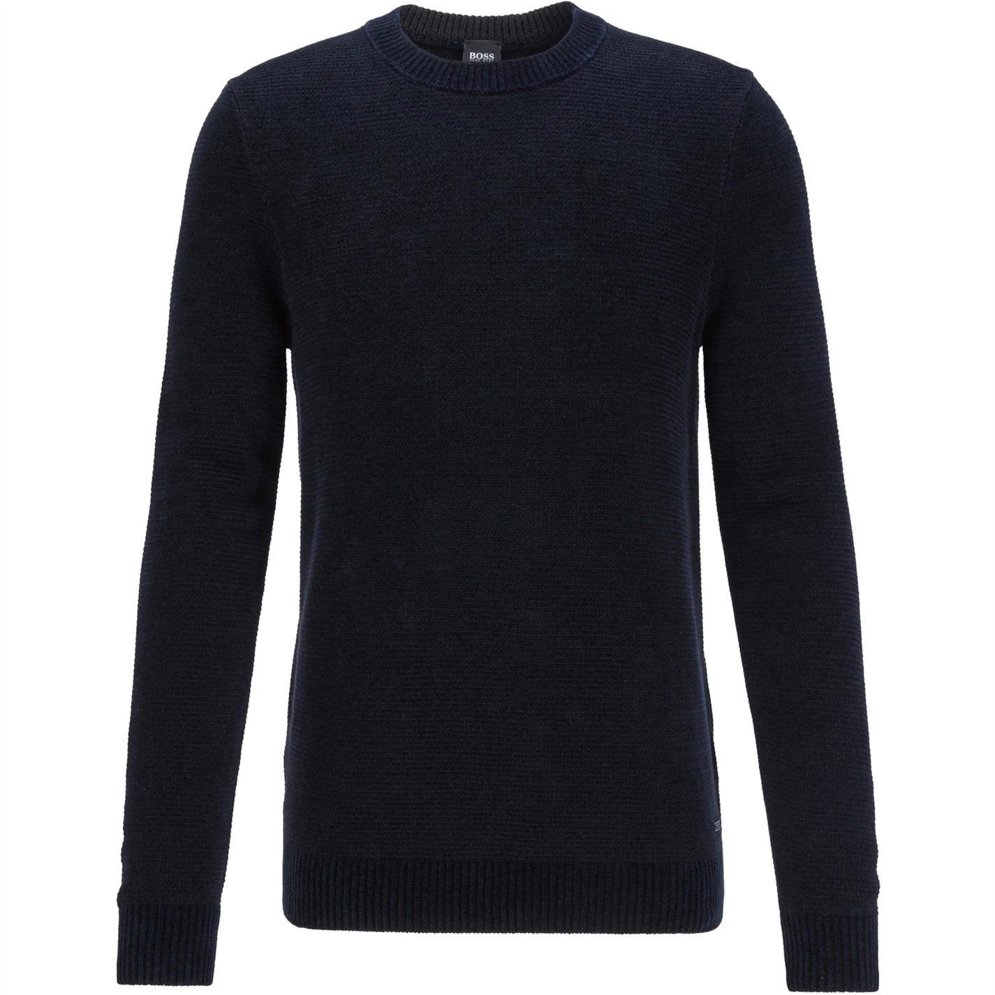 Refresh your collection with this BOSS Afulos Knit Jumper. Constructed with a ribbed crew neckline and long sleeves for a classic look, it features elasticated hems for a comfortable fit. This sweater is a solid colouring throughout with a signature logo and is complete with BOSS branding.