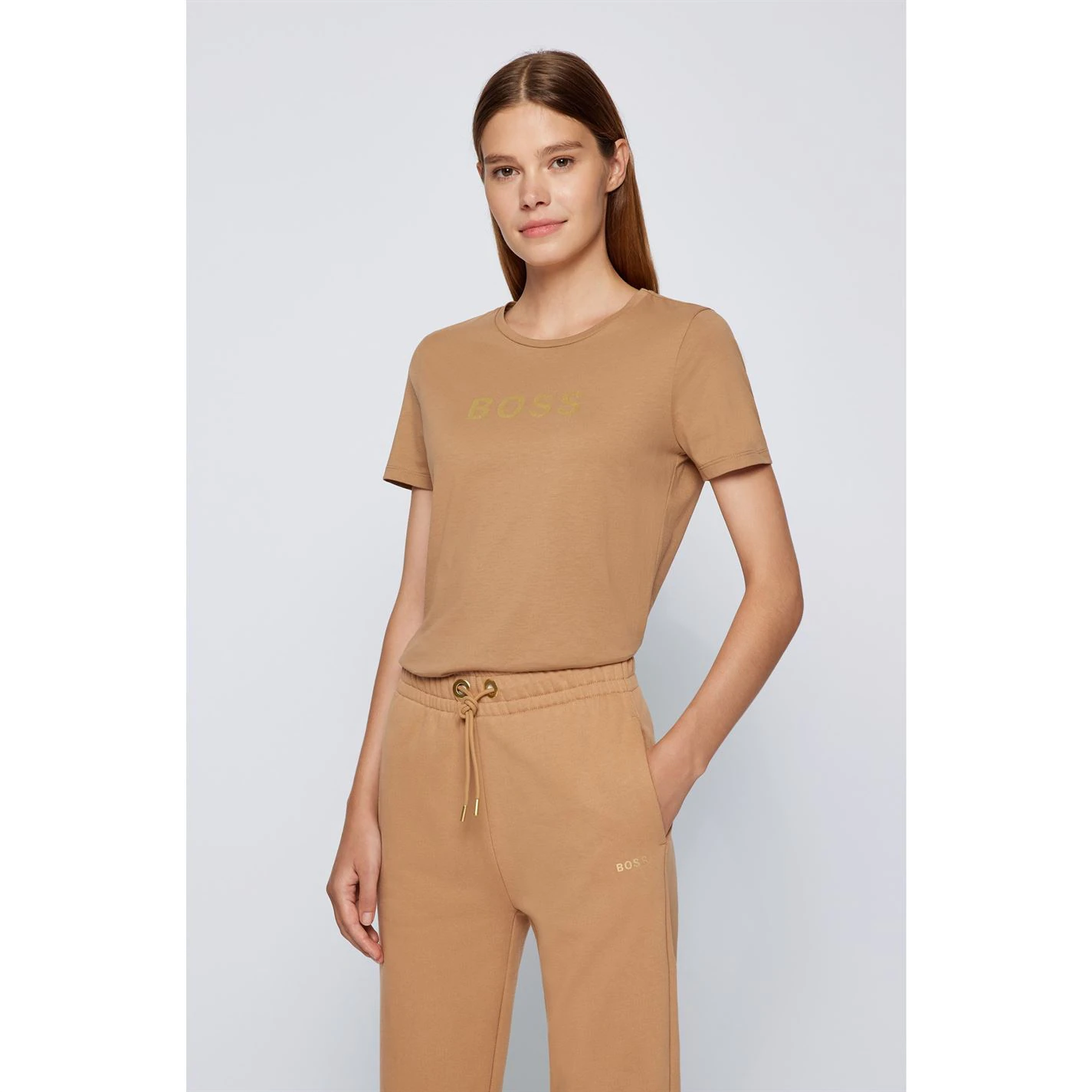 The Boss Eloga Gold T Shirt is a perfect addition to your casual wardrobe, crafted with a round neck collar, short sleeves and flat lock seams provides all day comfort, a graphic print to the centre chest gives a simple but stylish look, completed with the Boss branding. Style this T Shirt with an array of different fits all through the year, dressing up or down for a classic, timeless approach.