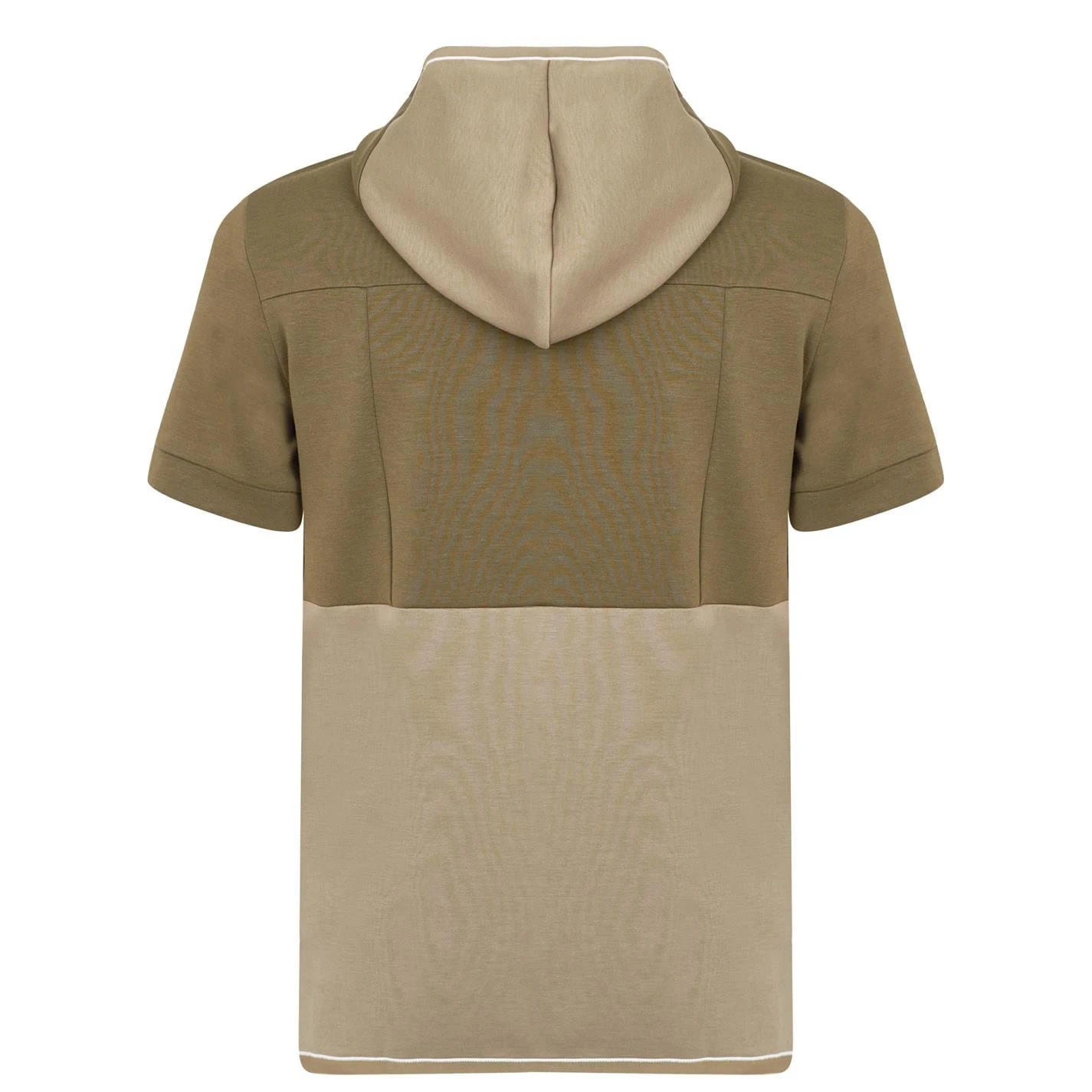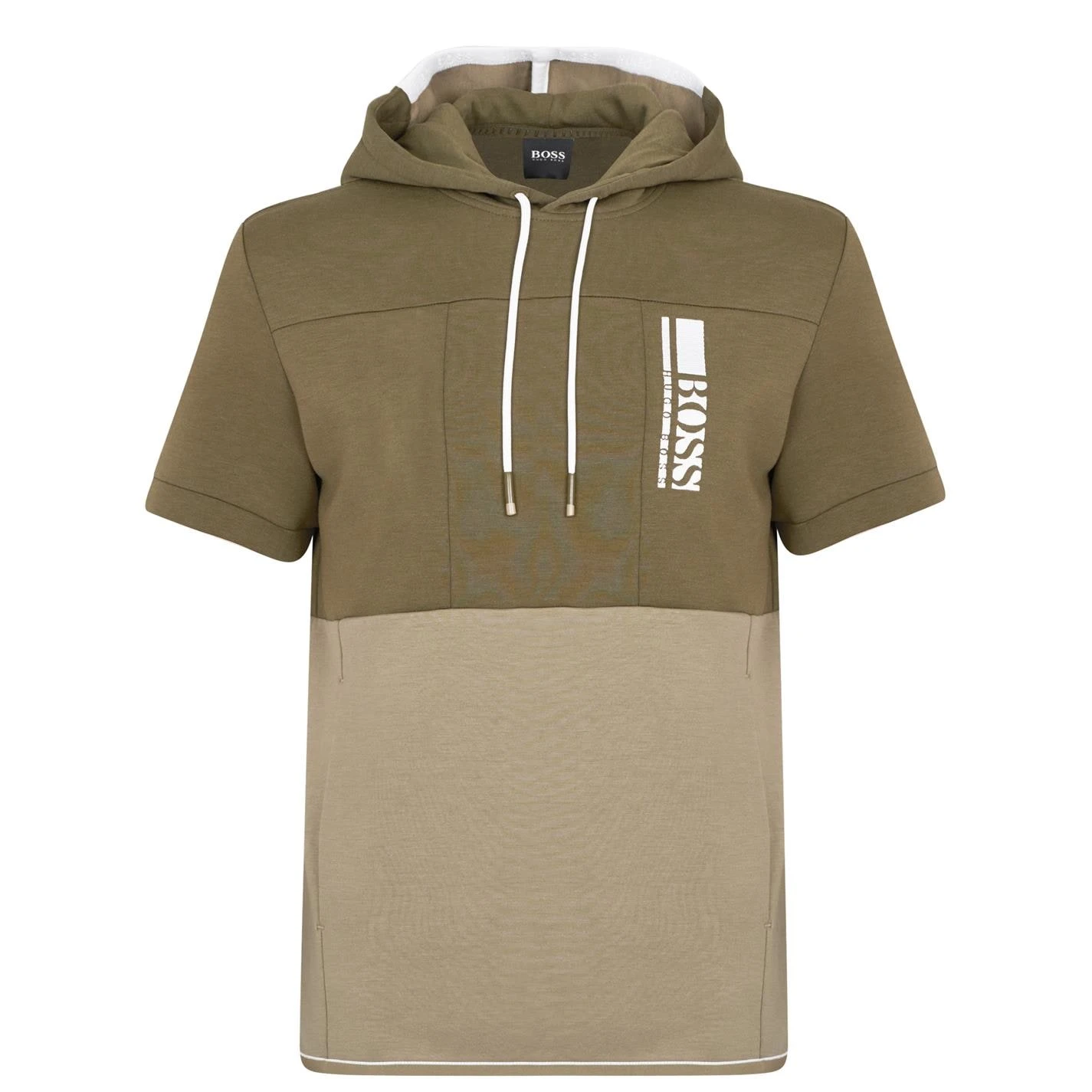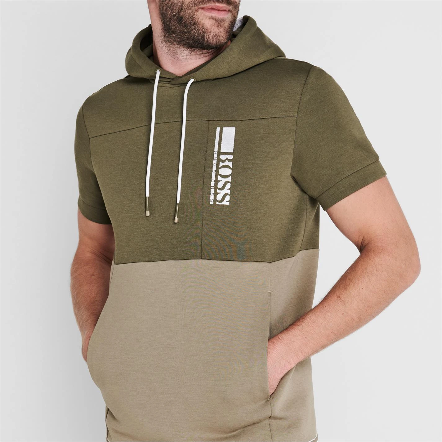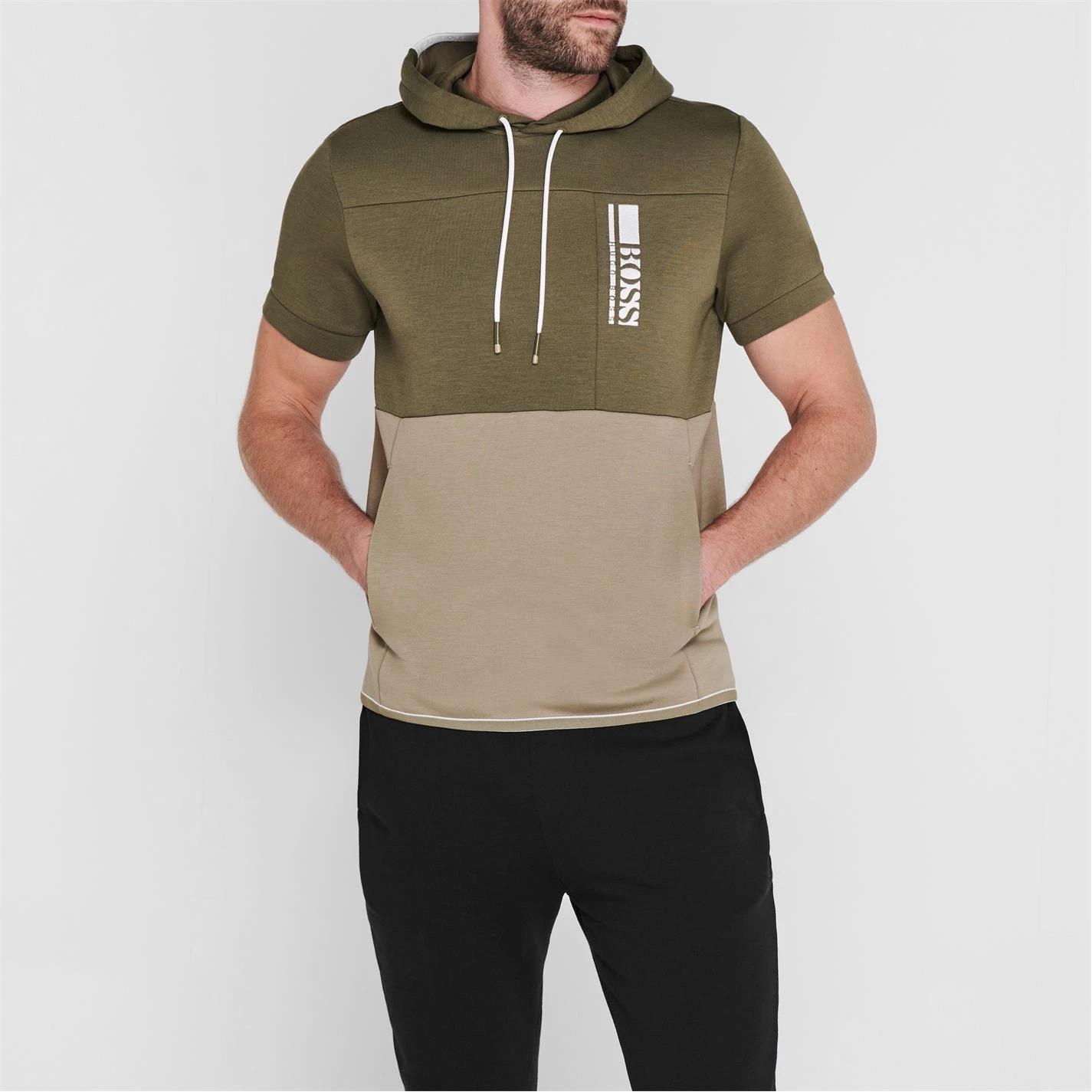 This classic, short sleeved sweat top by BOSS has been crafted with regular fitting, designed with a colour-block logo at the chest and two-tone drawstring cords for added comfort and insulation. Made using breathable fabric and finished with branded accents at the hood, this T Shirt inspired hoodie styles a fixed hood, short sleeves and slip pockets to the front. Made from 47% Cotton, 46% Polyester and 7% Elastane.
