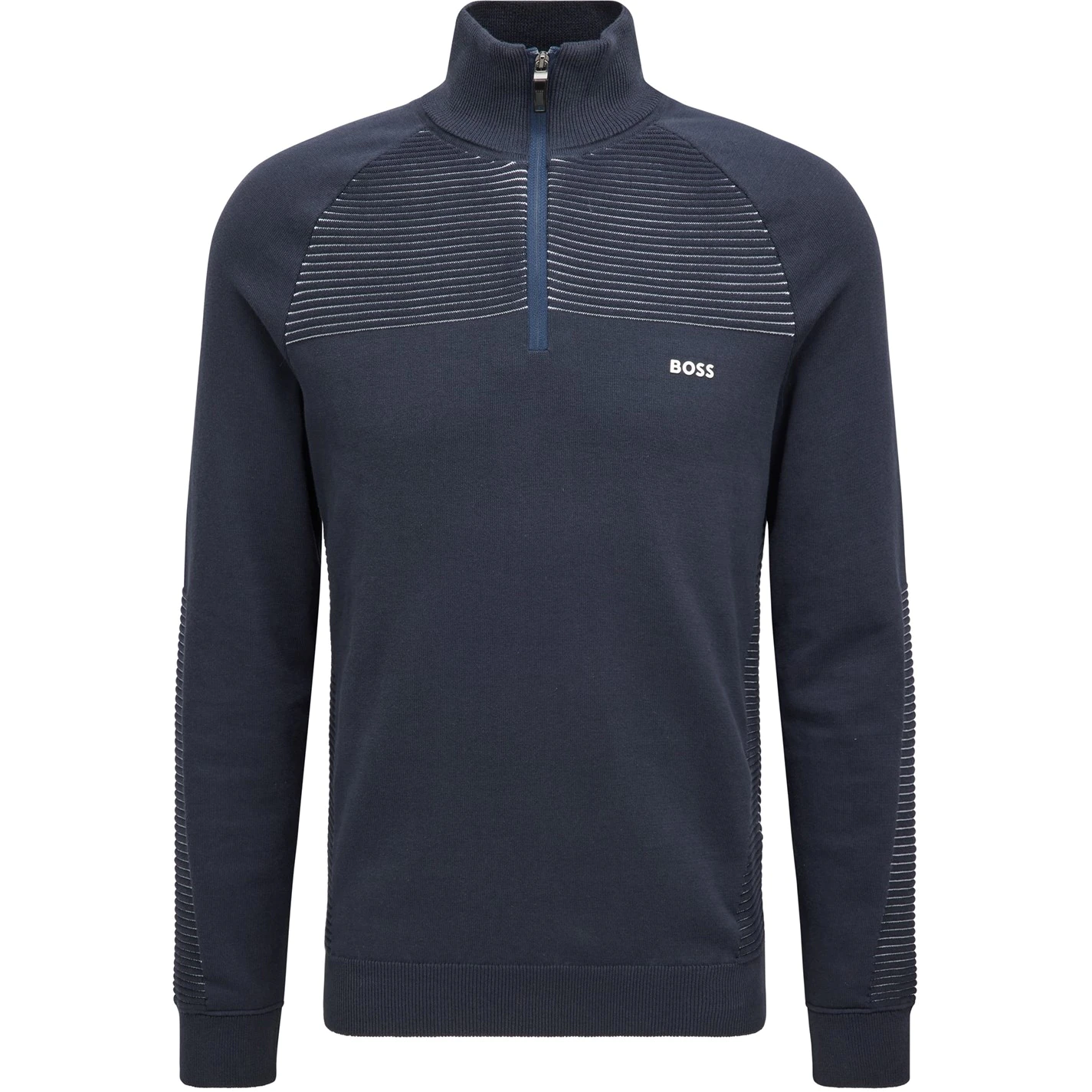 Switch up your casual style with this Jumper from Boss. This Jacket has been crafted in a regular fit with long sleeves, a 1/4 front zip fasten and ribbed trims for added comfort. The look is then finished with Boss branding to the main body with the logo shown on the left chest area.