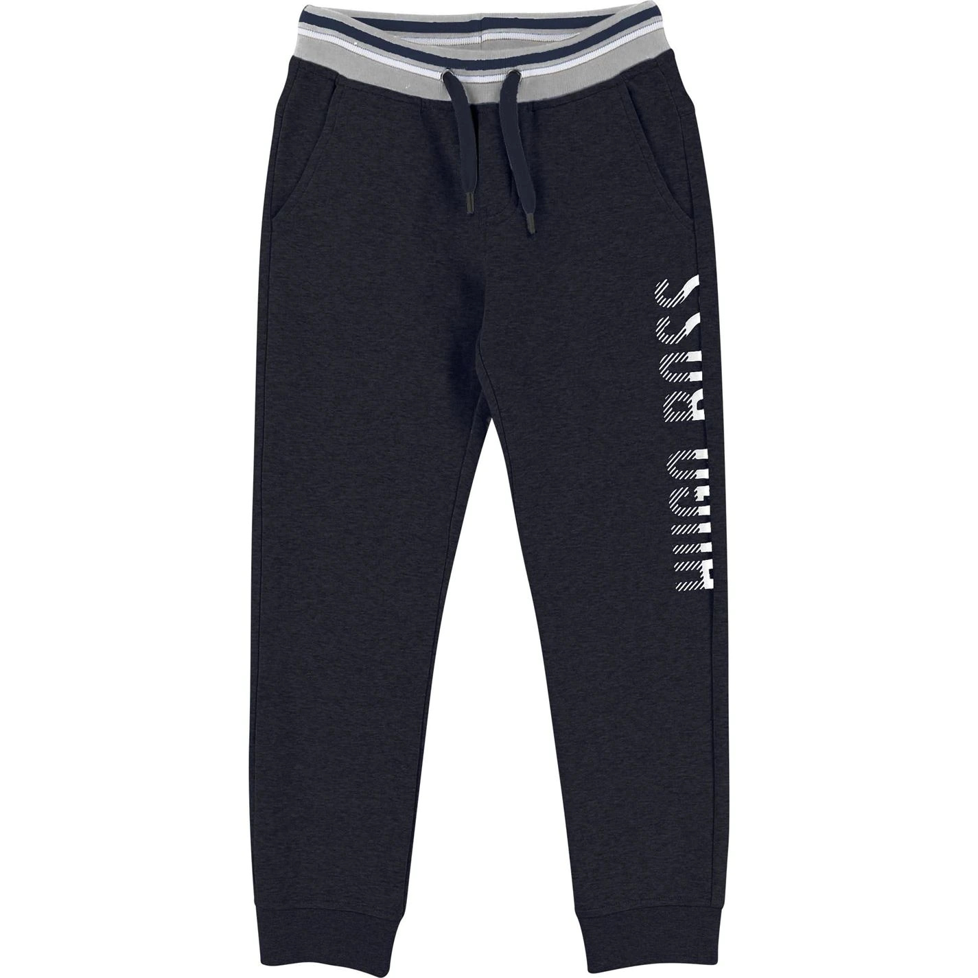 Cotton polyester fleece tracksuit pants, drawstring at waist, striped rib belt + high density logo print.