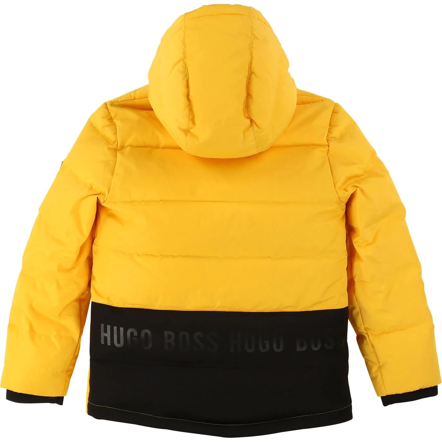 Hooded puffer jacket with front pockets and printed logo on the chest
