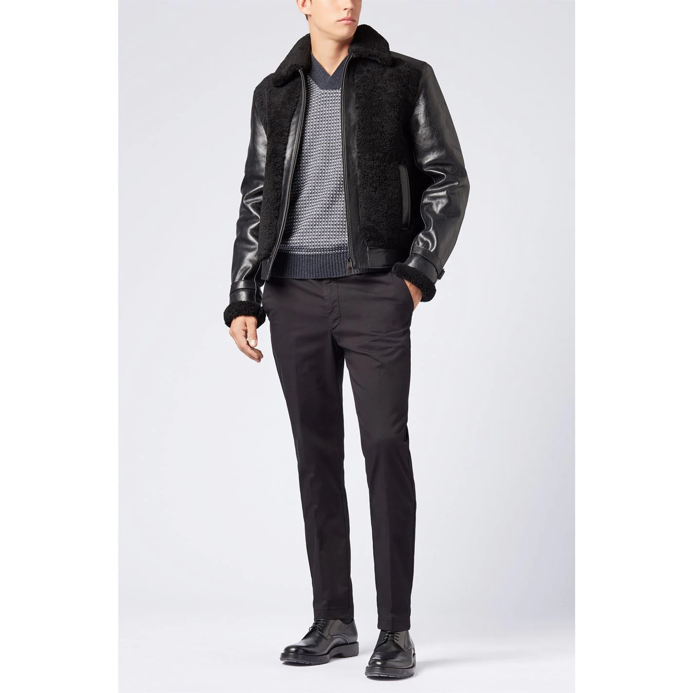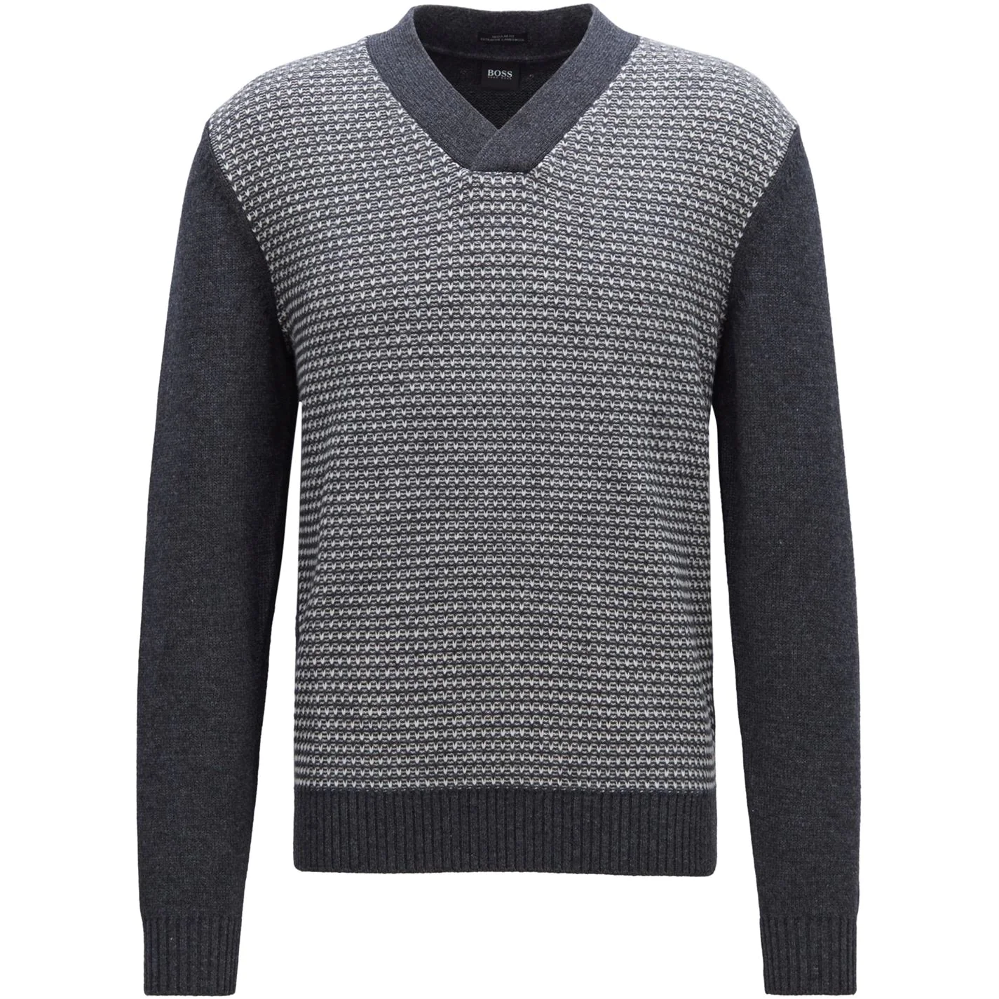 Update your everyday knitwear collection with this Efranco V-Neck Jumper from BOSS crafted from a textured knit fabric for a great combination of comfort and style. The jumper is cut in a classic regular fit with long sleeves and ribbed edges, while the ribbed crossover V-neck defines the style. The design features a patterned chest with contrast sleeves and edges for a versatile look.
