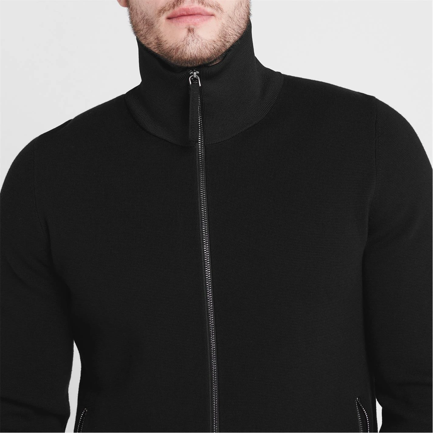 Crafted from a premium 100% Cotton fabrication, this thick ribbed knit silhouette details a solid colour-block for a simple but versatile piece perfect for everyday use. Designed with a funnel neckline, full zip fastening and long sleeves with ribbed cuffs, this jacket is complete with two zipped pockets and minimal branding to the hardware. Pair with a shirt and trousers for a smart-casual look.