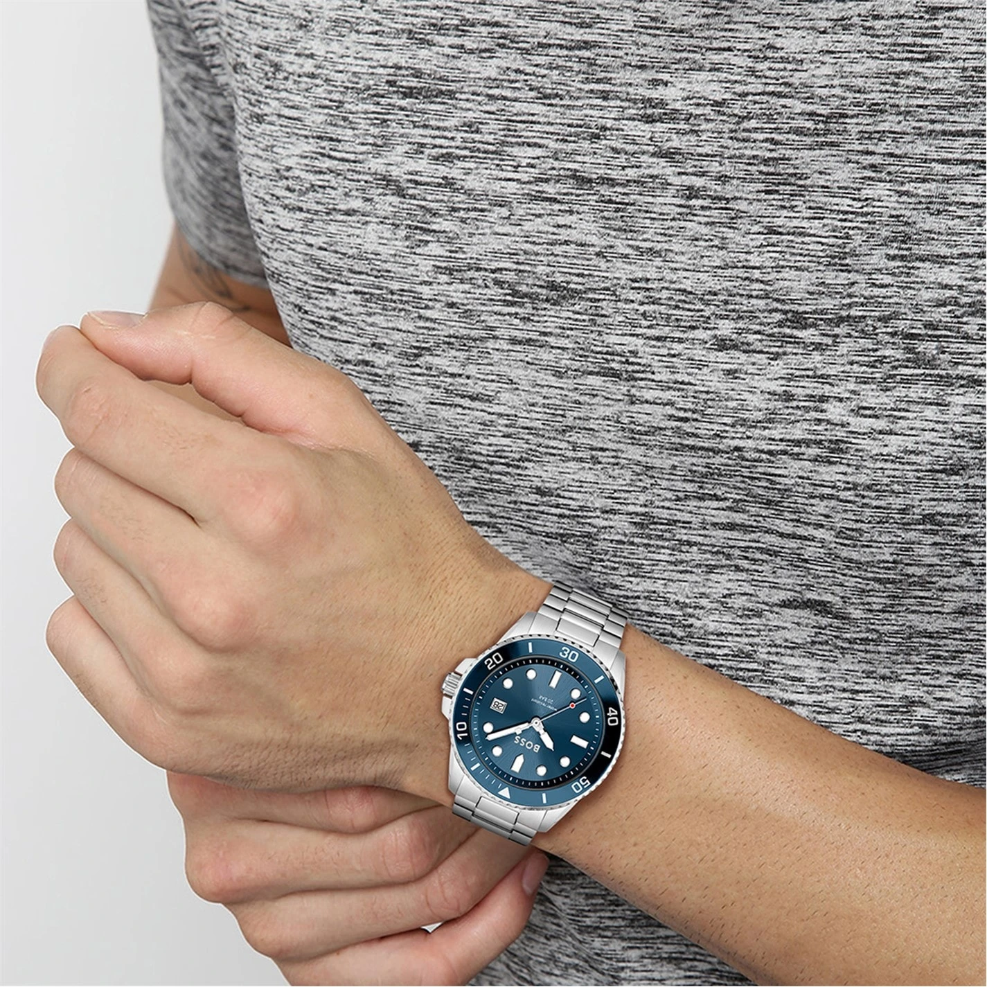 BOSS gents watch from the Ace family. Featuring a 43mm stainless steel case with blue bezel, blue sunray dial and stainless steel bracelet with push button deployment. Water resistant to 20ATM