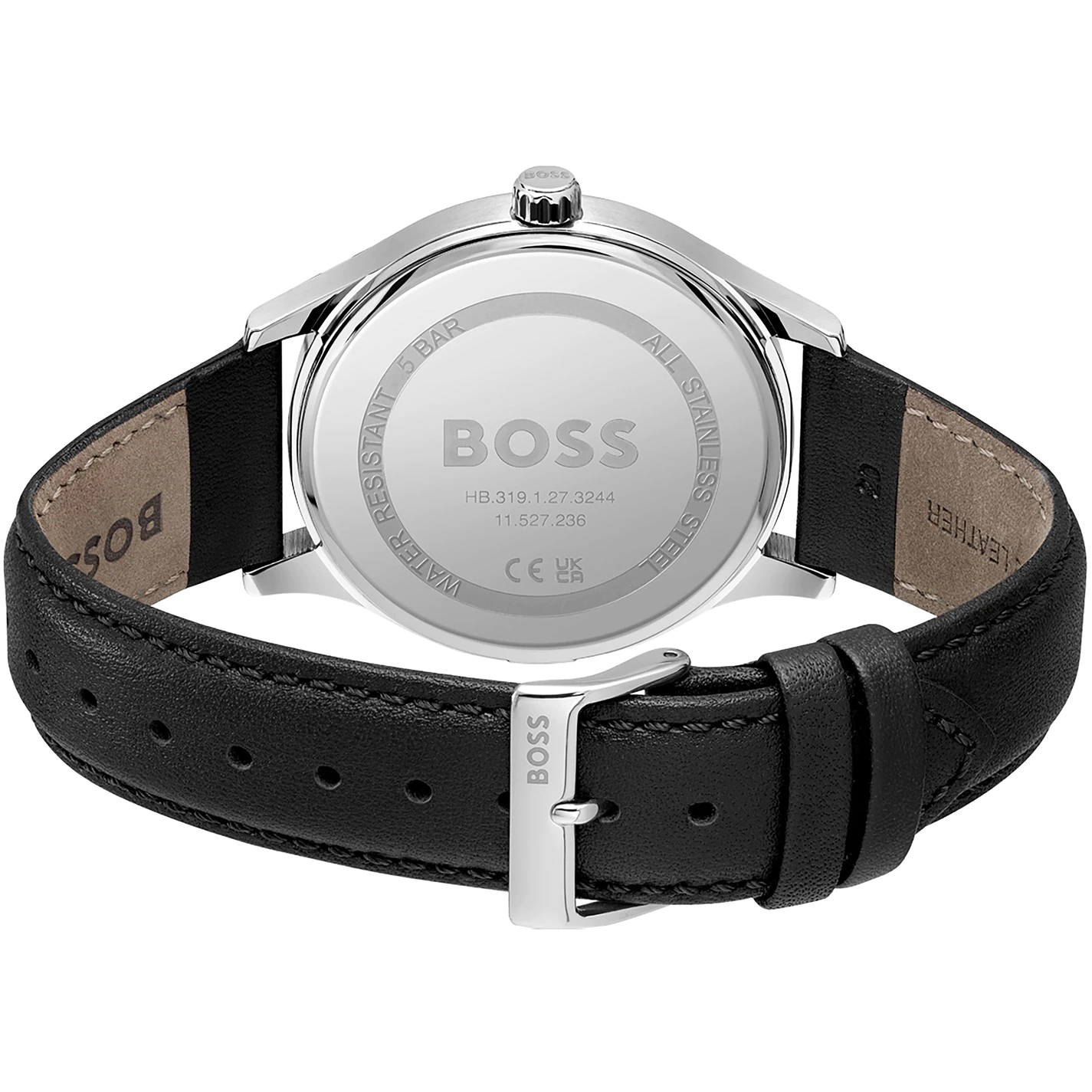 Achieving success is all about getting the details right. BOSS gents watch from the Elite family. Featuring a 41mm stainless steel case, black sunray dial, black leather strap and BOSS buckle. Water resistant to 5ATM