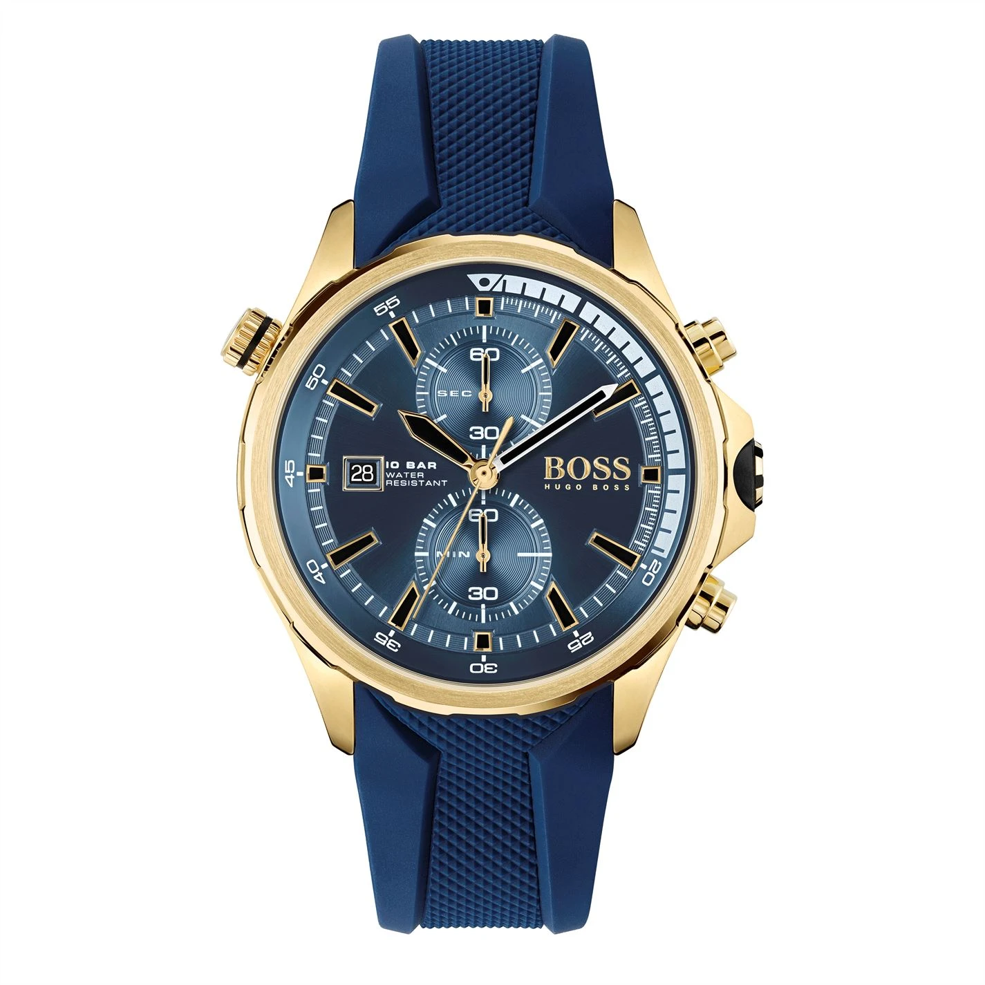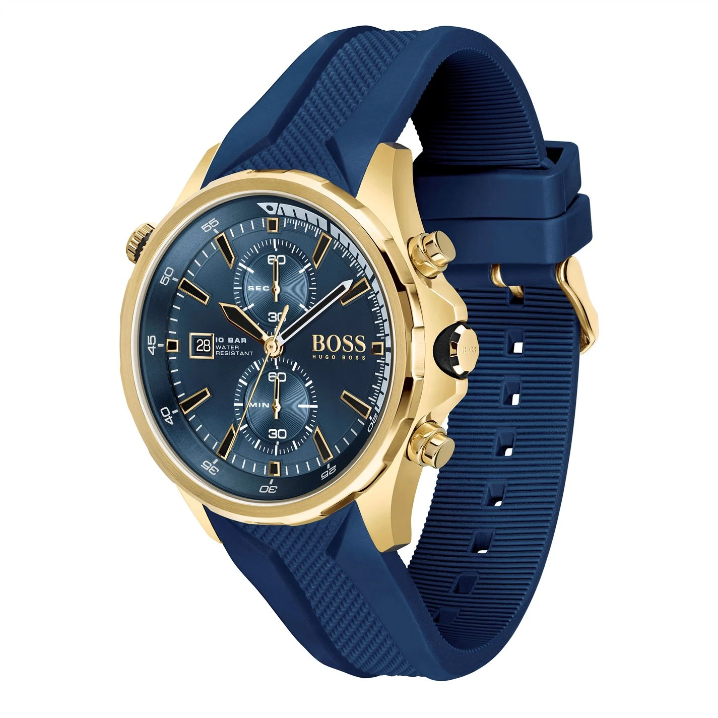 For the modern explorer. The nautical-inspired Globetrotter collection offers a striking new interpretation of the diver’s watch, with water resistance of 10 ATM. Featuring a 46mm gold IP case, chronograph movement with rotating reflector ring, blue dial with yellow gold and white details and blue silicone strap.