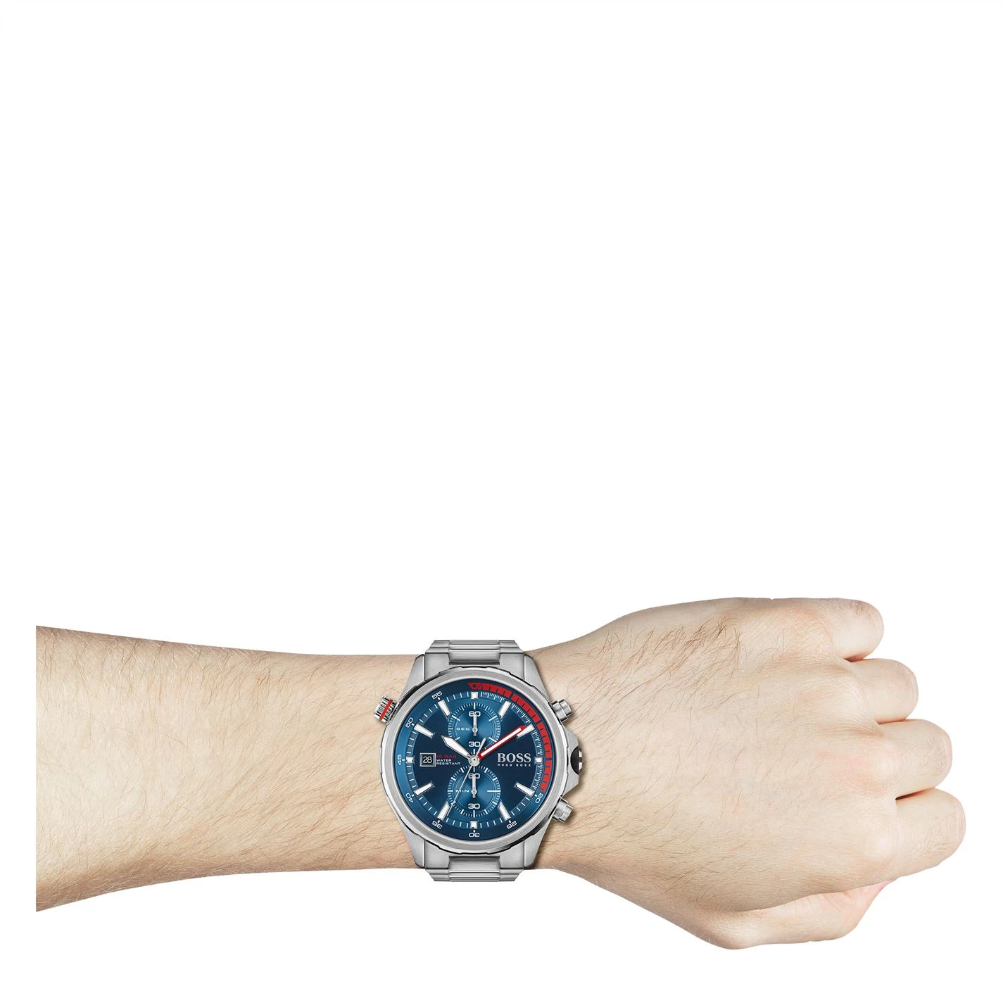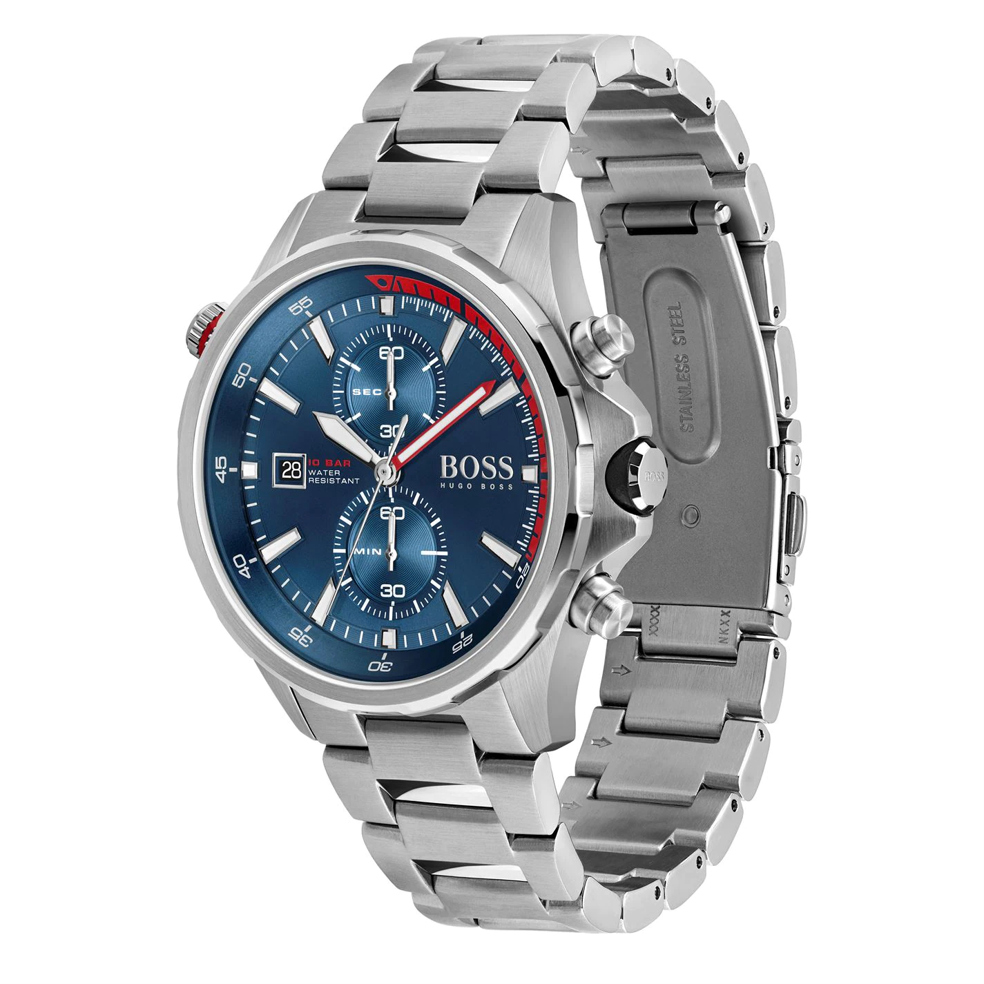 For the modern explorer. The nautical-inspired Globetrotter collection offers a striking new interpretation of the diver’s watch, with water resistance of 10 ATM. Featuring a 46mm stainless steel case, chronograph movement with rotating reflector ring, blue dial with red details and stainless steel bracelet. Water resistant to 10ATM.