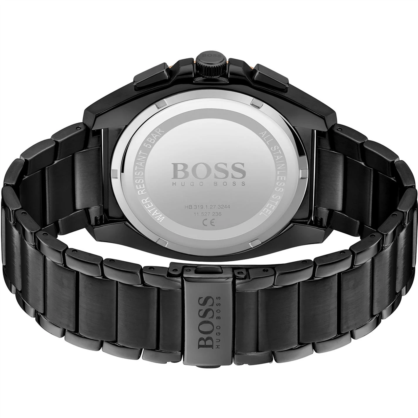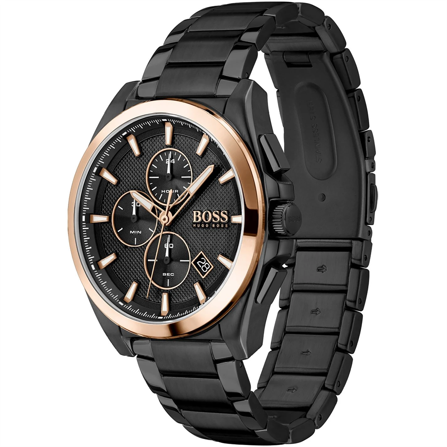 Designed with action and adventure in mind, the Grandmaster from BOSS Watches is a contemporary chronograph with a sporty aesthetic. Featuring a 46mm black IP case, black textured dial with carnation gold IP detail, carnation gold IP bezel, black IP bracelet and push button deployment. Water resistant to 5ATM