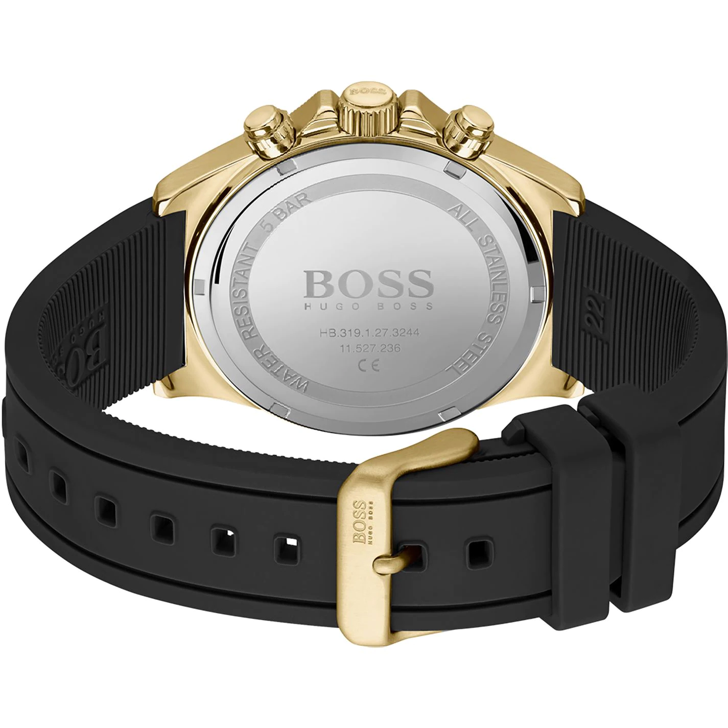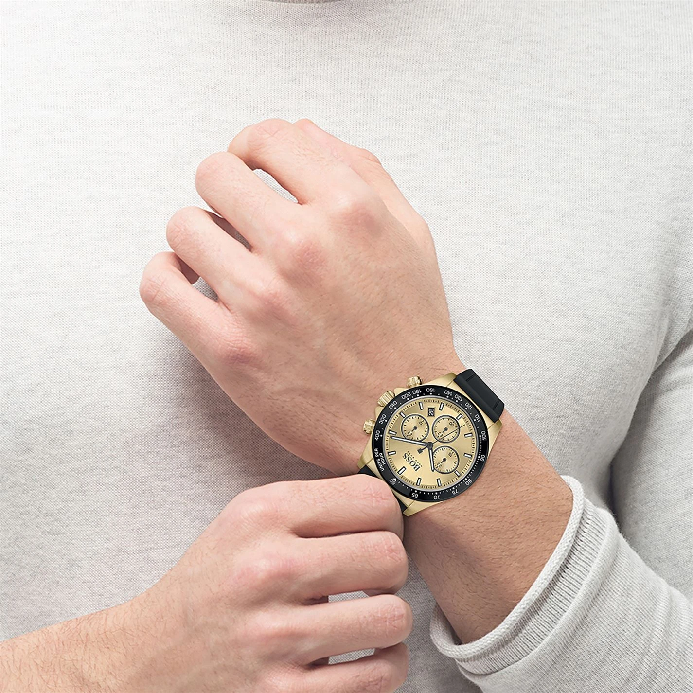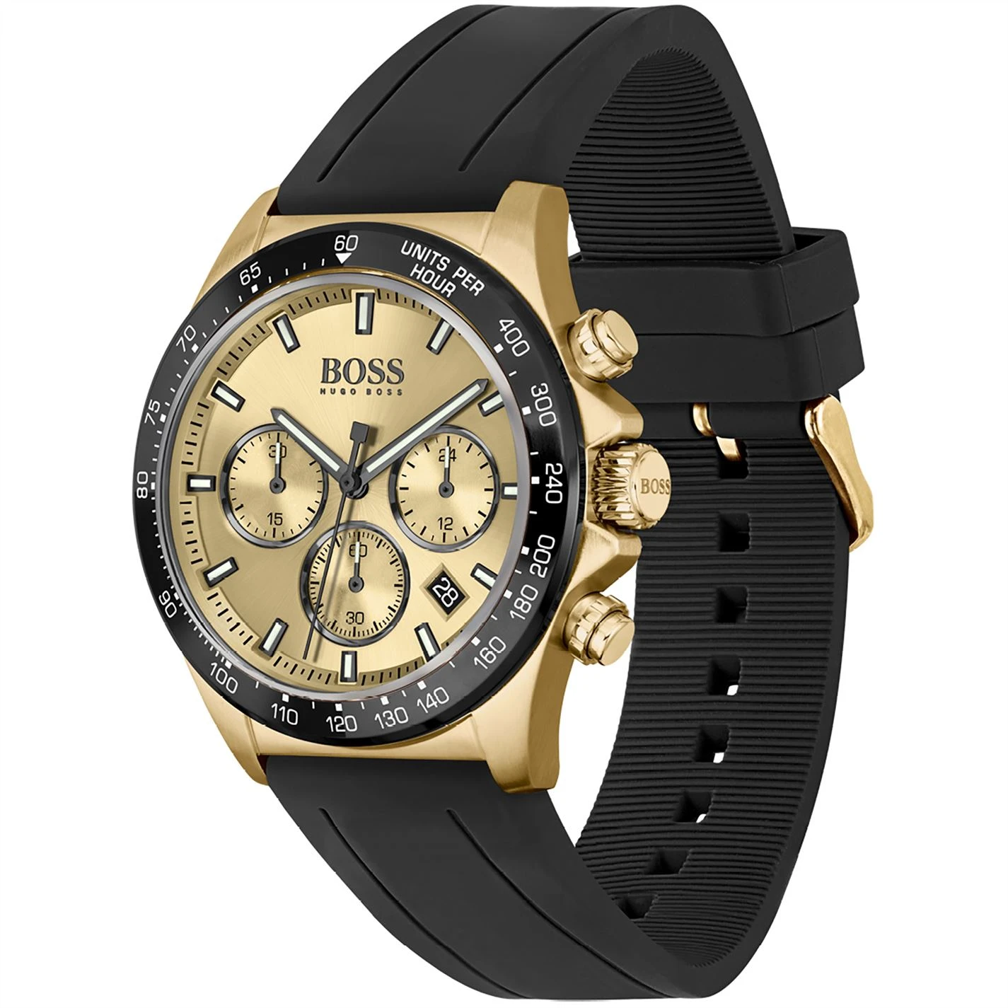 They say you should never meet your heroes – but this one certainly won’t disappoint you. Just like the man who wears it, this markedly masculine model confidently combines resolute ruggedness with sophisticated style.Featuring a 43mm gold IP case, gold sunray dial, black tachymeter bezel, black silicone strap and BOSS buckle. Water resistant to 5ATM