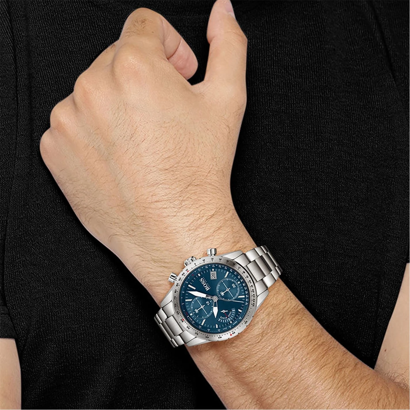 Adventure awaits with the BOSS Pilot Edition Chrono. A confident and stylish design, this retrograde chronograph with date function marries aviation-inspired functionalities with a sporty aesthetic. Featuring a 44mm stainless steel case with slide-rule bezel, retrograde chronograph movement, blue dial and stainless steel bracelet. Water resistant to 5ATM