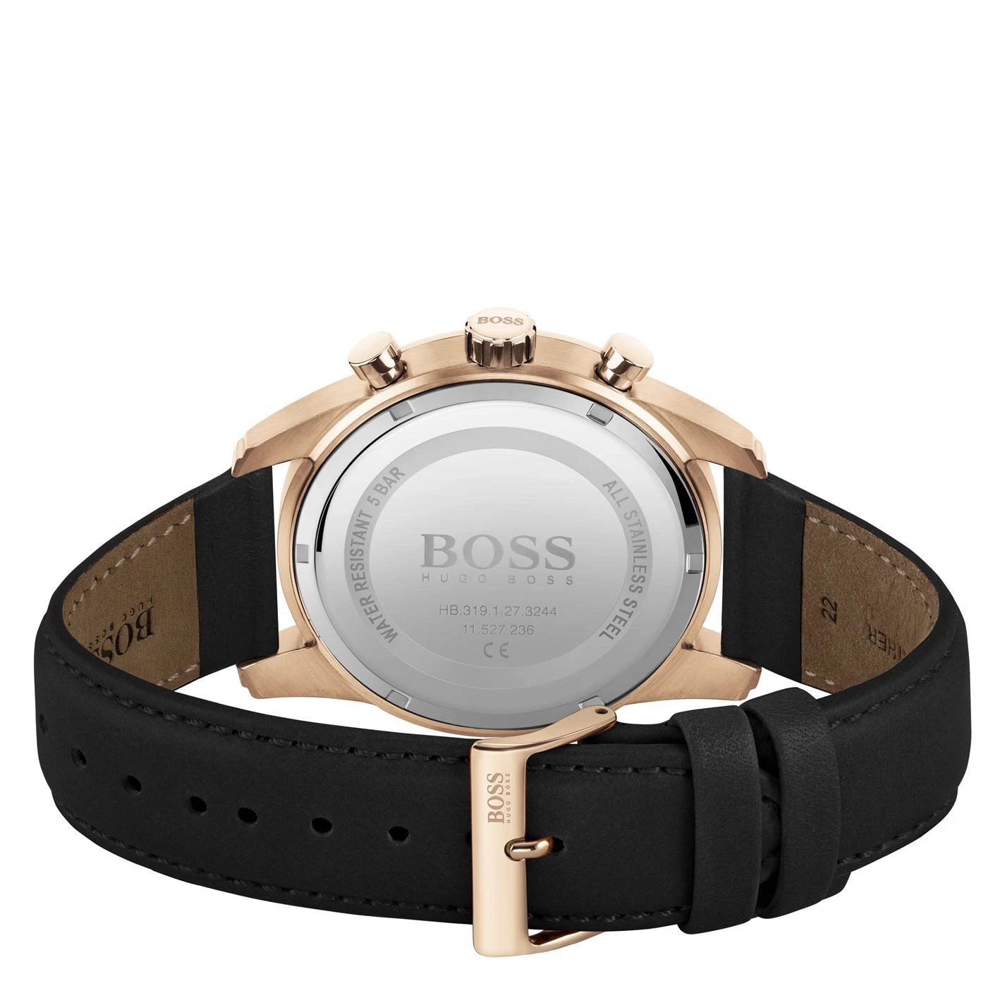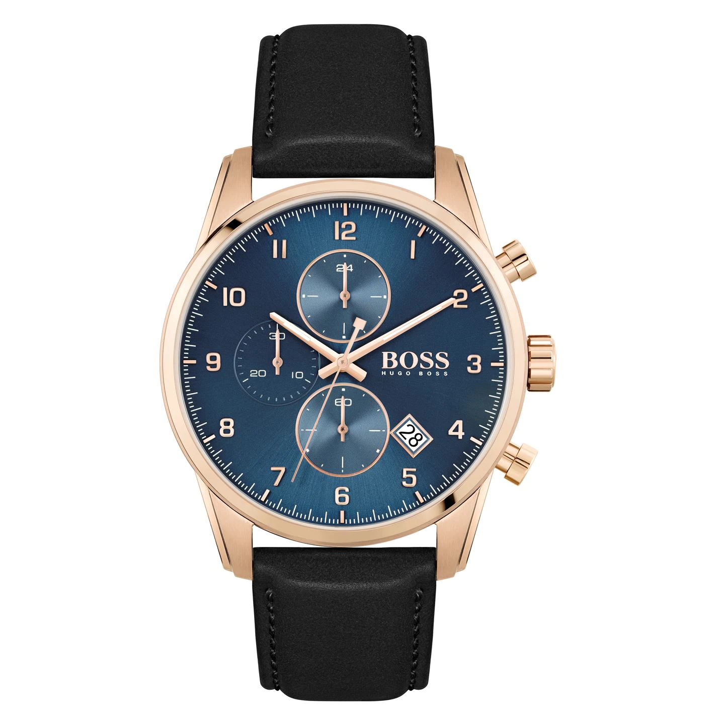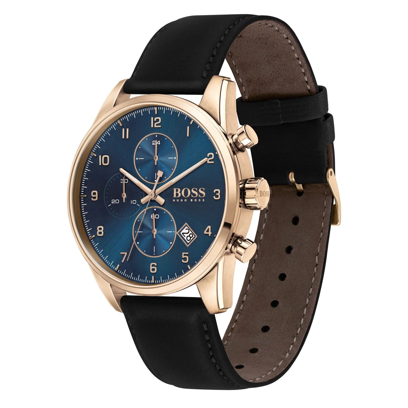 The sky is the limit, and the BOSS Skymaster captures this spirit of adventure through a masculine, aviator-inspired design.Featuring a 44mm carnation gold IP case, blue dial, black leather strap and BOSS buckle. Water resistant to 5ATM.