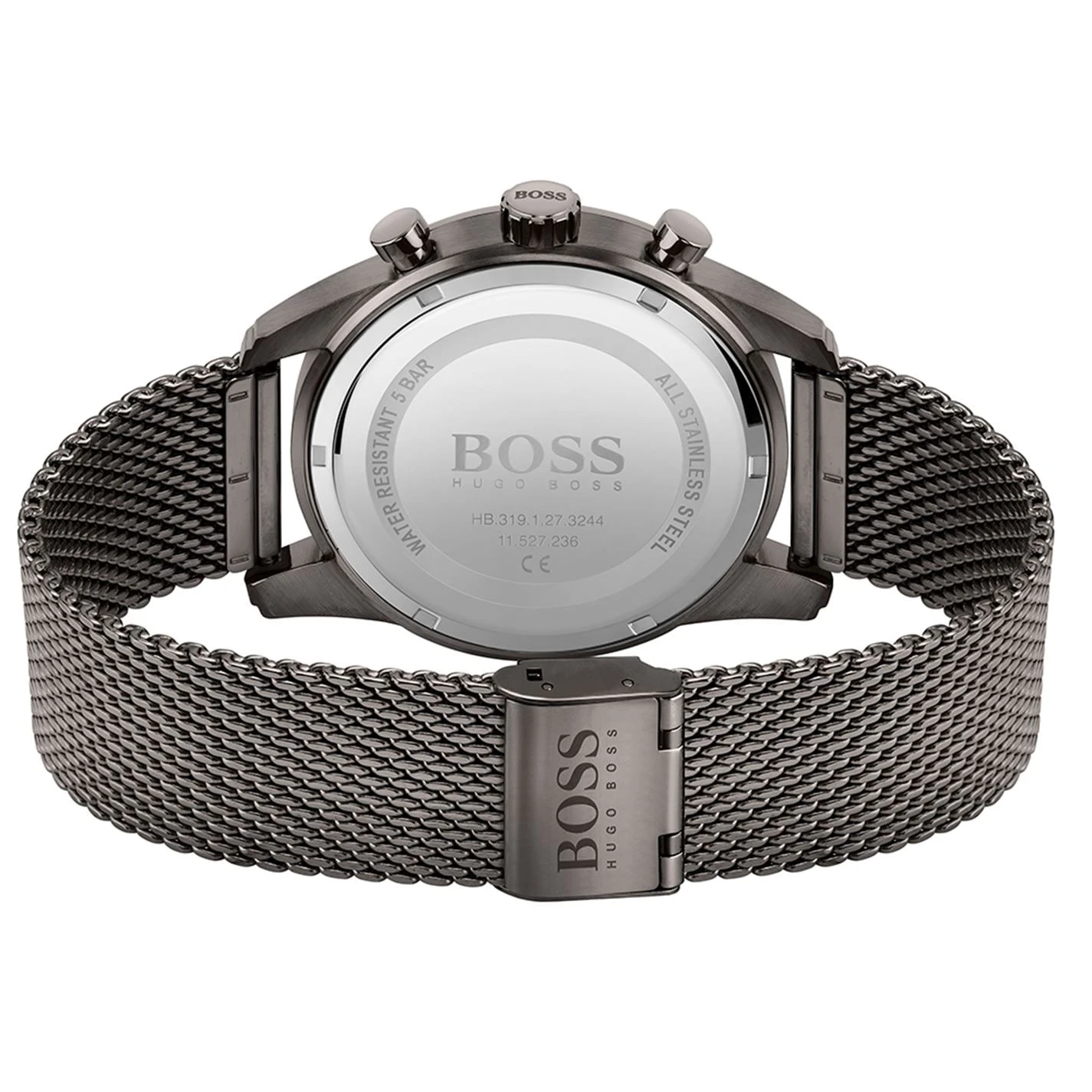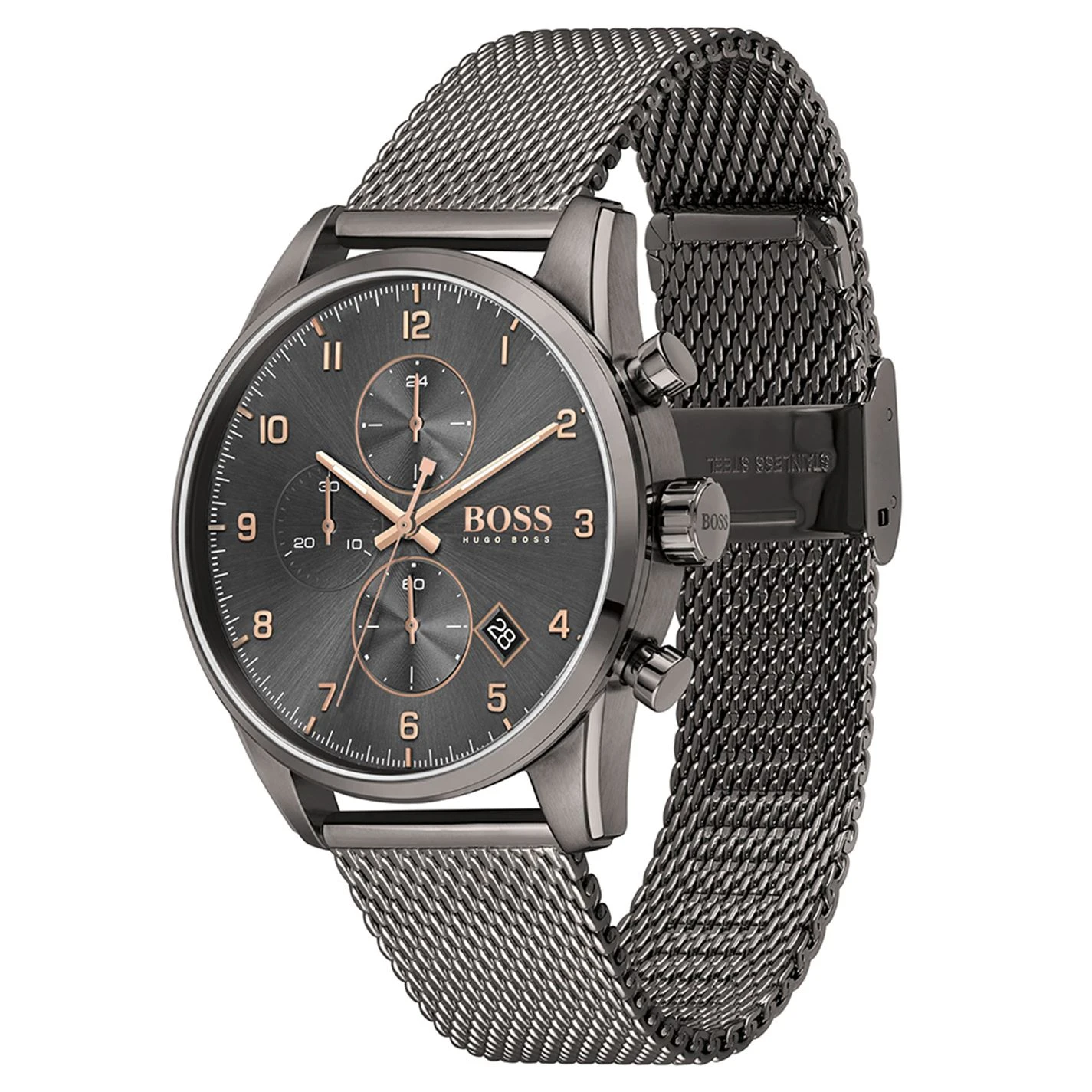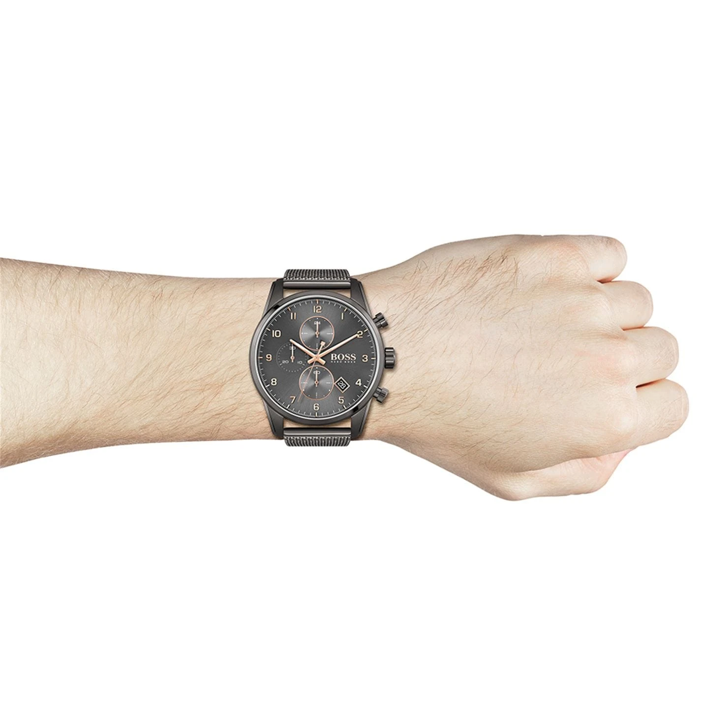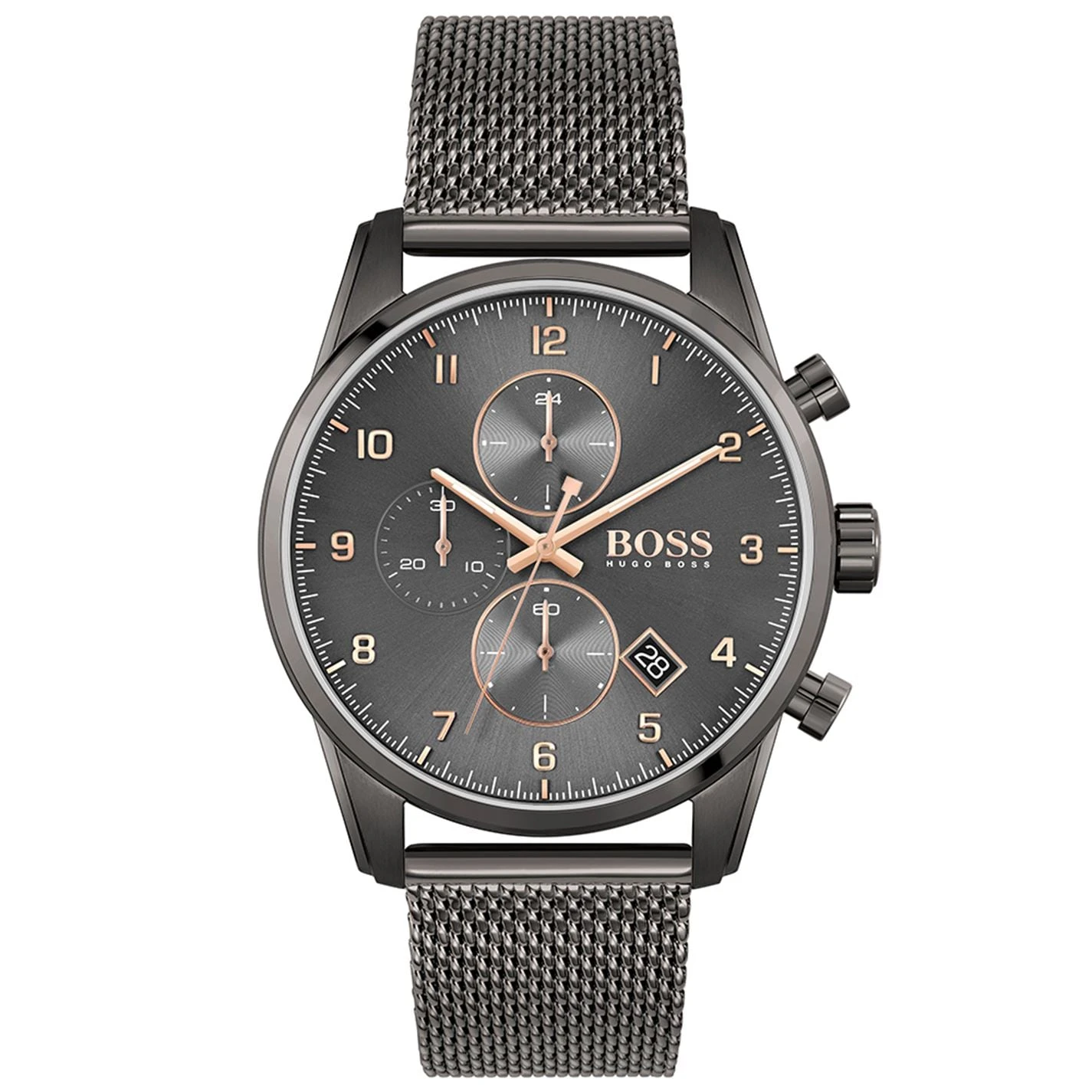 The sky is the limit, and the BOSS Skymaster captures this spirit of adventure through a masculine, aviator-inspired design. Featuring a 44mm grey IP stainless steel case, grey dial with carnation gold IP details and grey IP mesh bracelet. Water resistant to 5ATM.