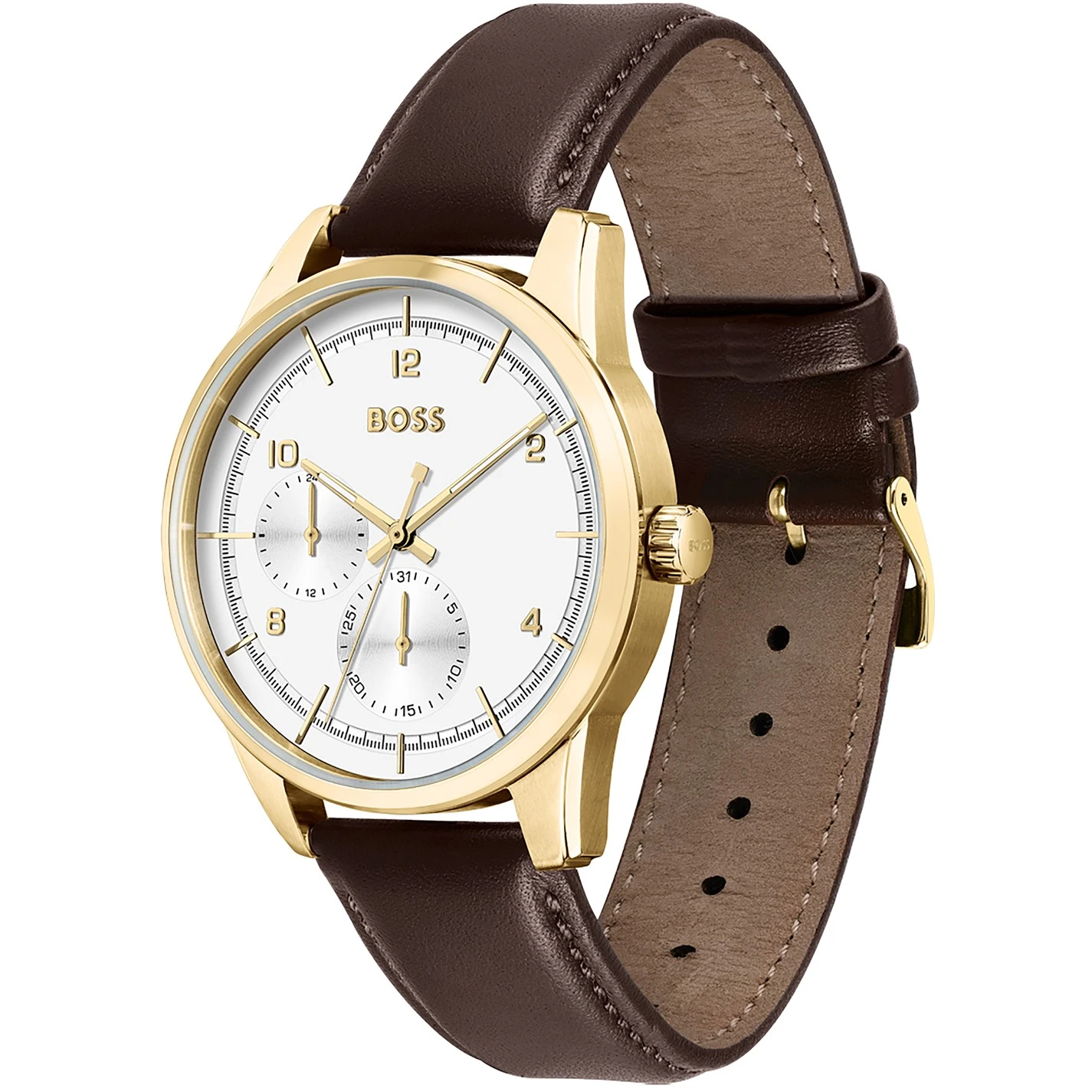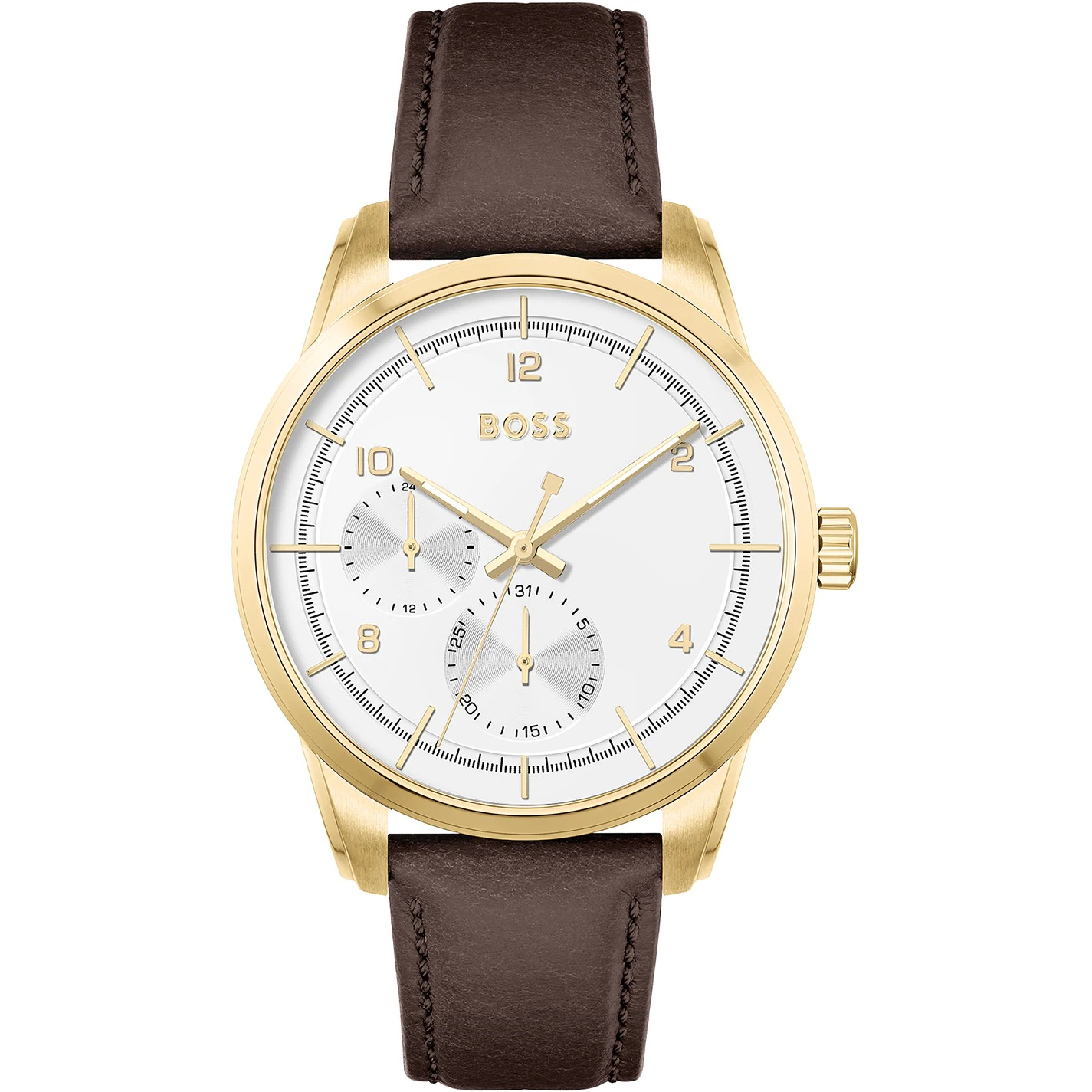 BOSS gents watch from the Soffio family. Featuring a 42mm yellow gold IP stainless steel case, white sunray dial and brown leather strap with buckle. Water resistant to 5ATM