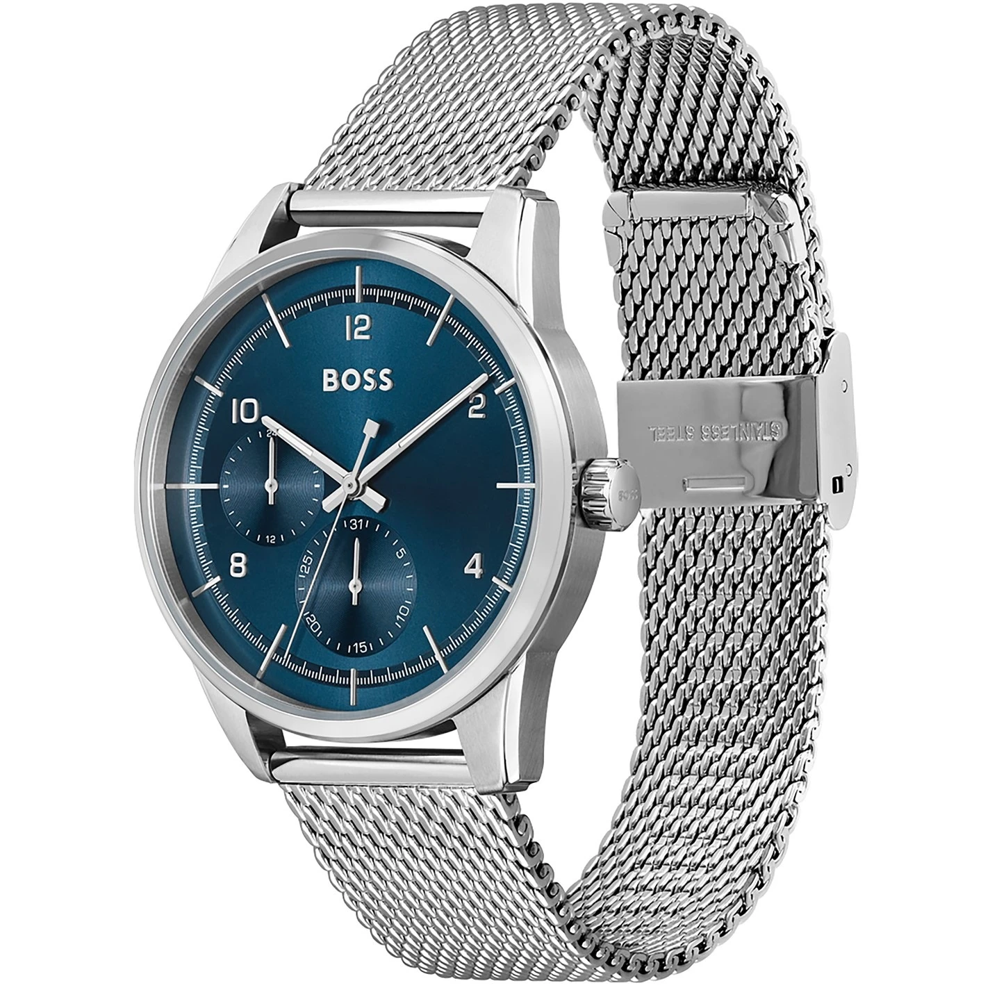 BOSS gents watch from the Soffio family. Featuring a 42mm stainless steel case, blue sunray dial and stainless steel mesh strap with clasp. Water resistant to 5ATM