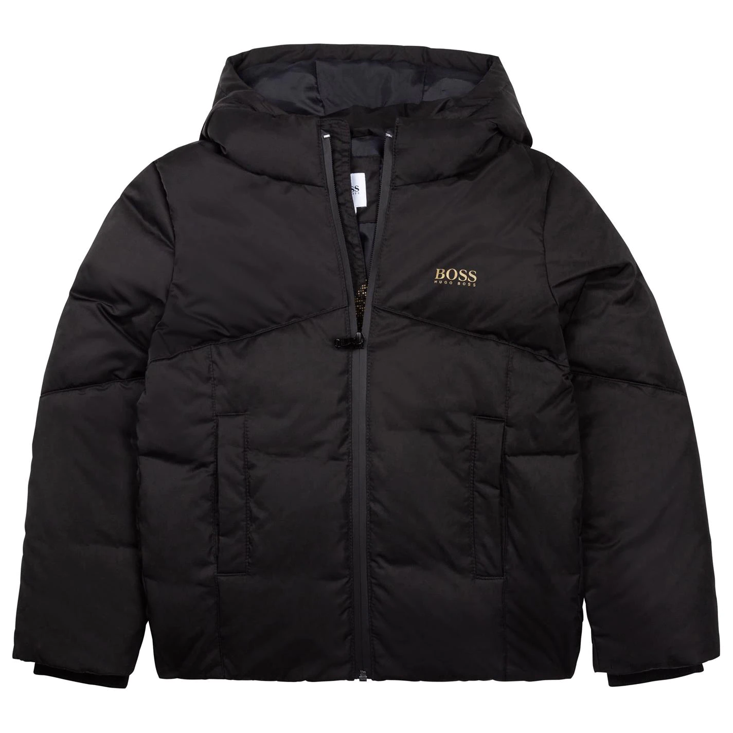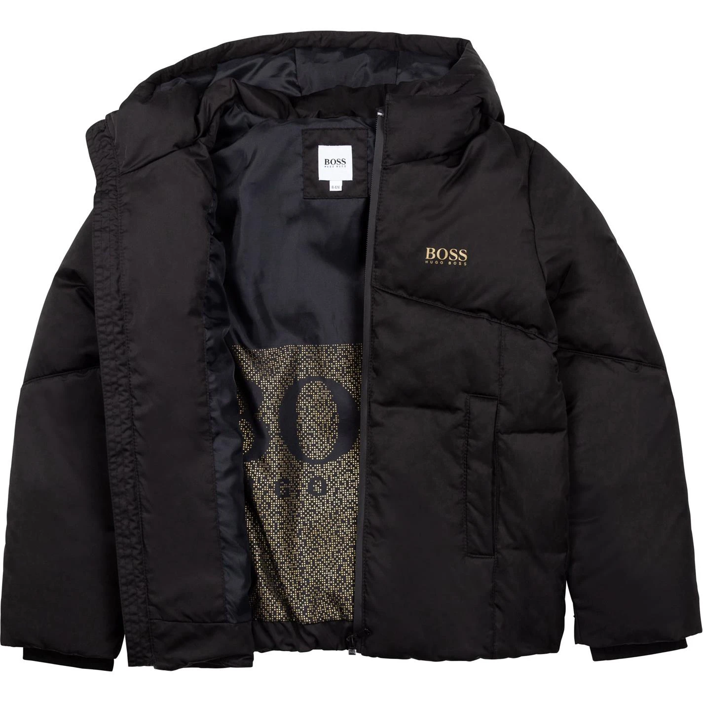Update their collection with this BOSS Gold Logo Jacket. Crafted with full zip fastening and long sleeves with ribbed cuffs for a classic look, it features a hooded neckline and two hand pockets for a classic look. This jacket is designed with a signature logo printed to the chest and is complete with BOSS branding.