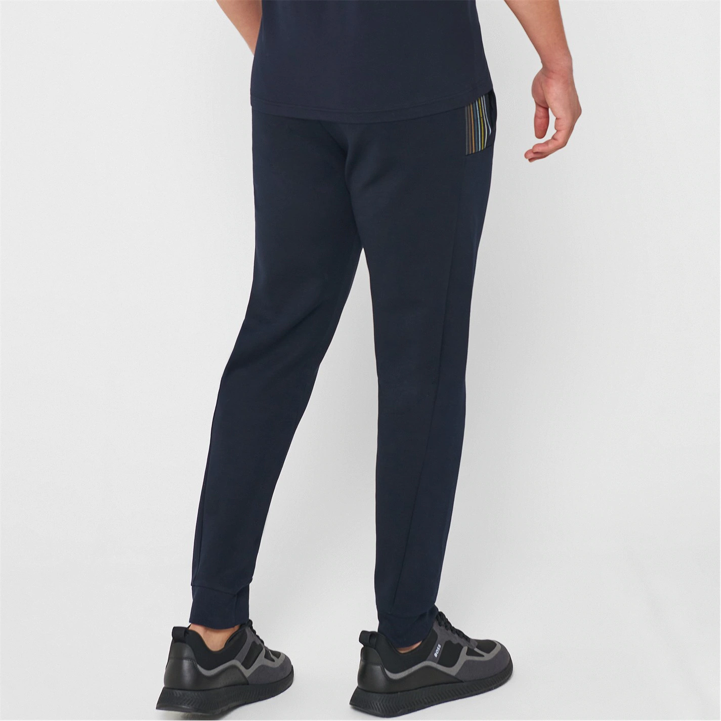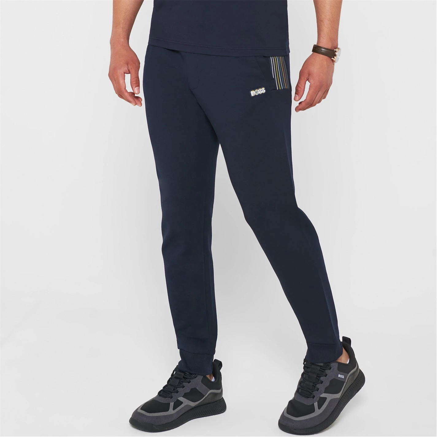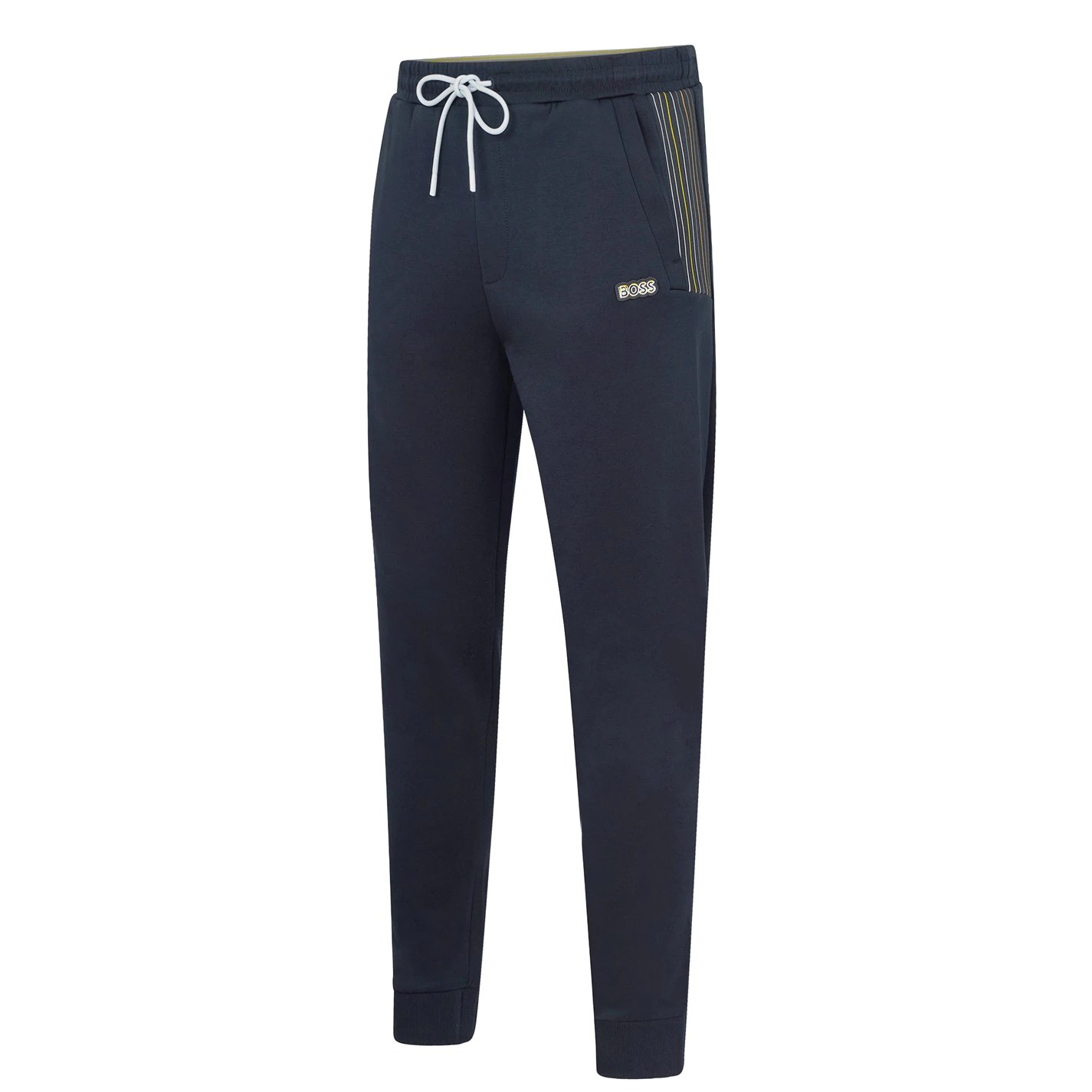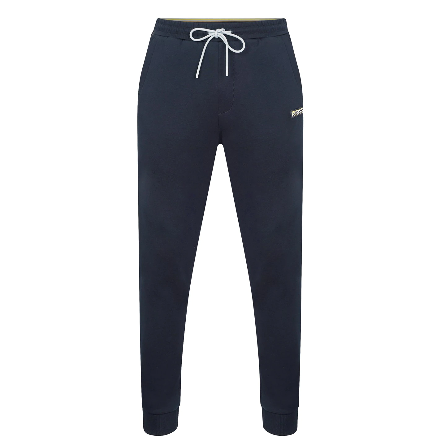 Update your designer bottoms collection with these Hadiko 1 Joggers from Boss. Constructed from a cotton material with an elasticated waist and external drawstring adjustment for an easy wear, they feature ribbed cuffs for everyday comfort and three pockets for improved storage functionality. Decorated in a solid colouring throughout with striped trim to the pockets and finished with the Boss logo to the leg for instant brand appreciation.