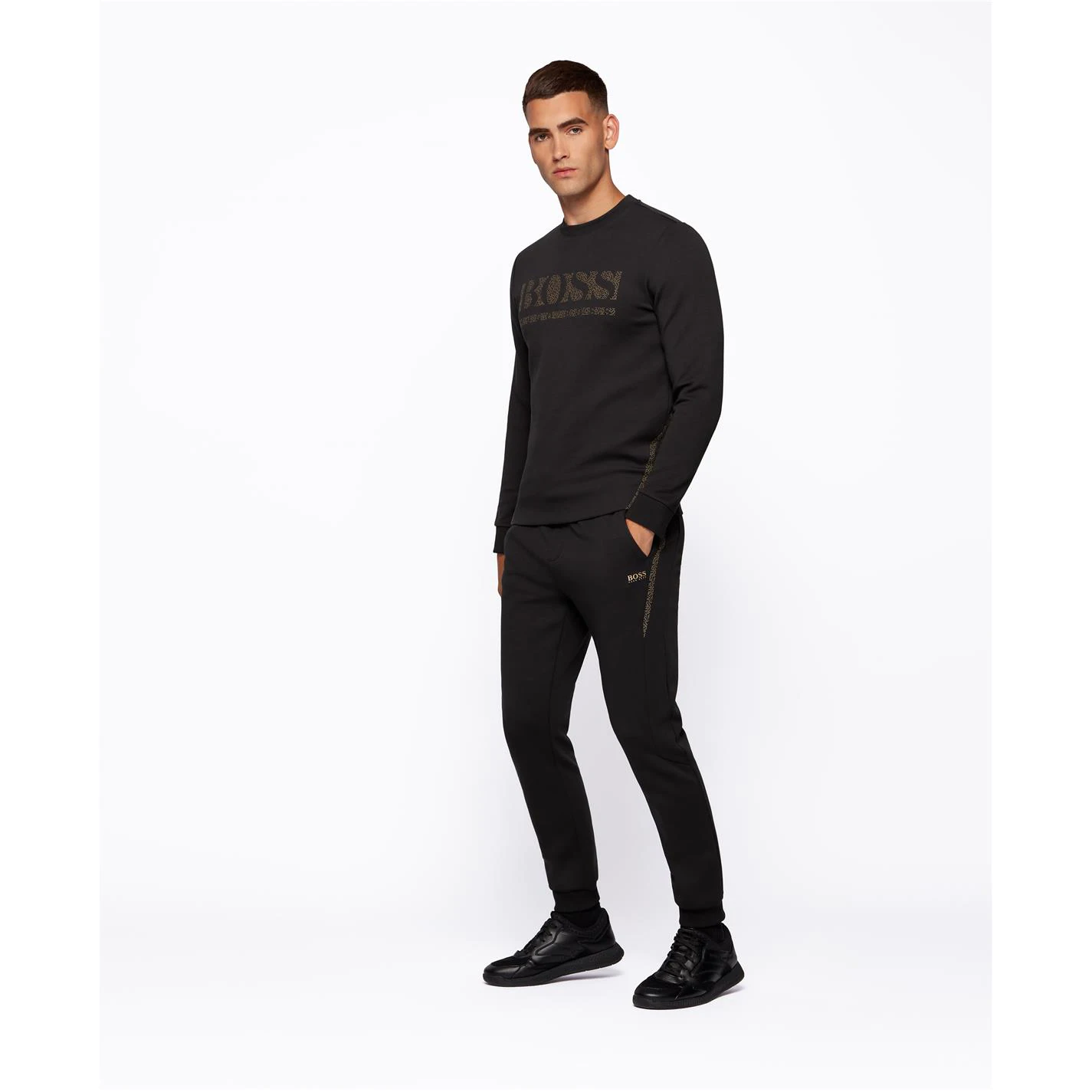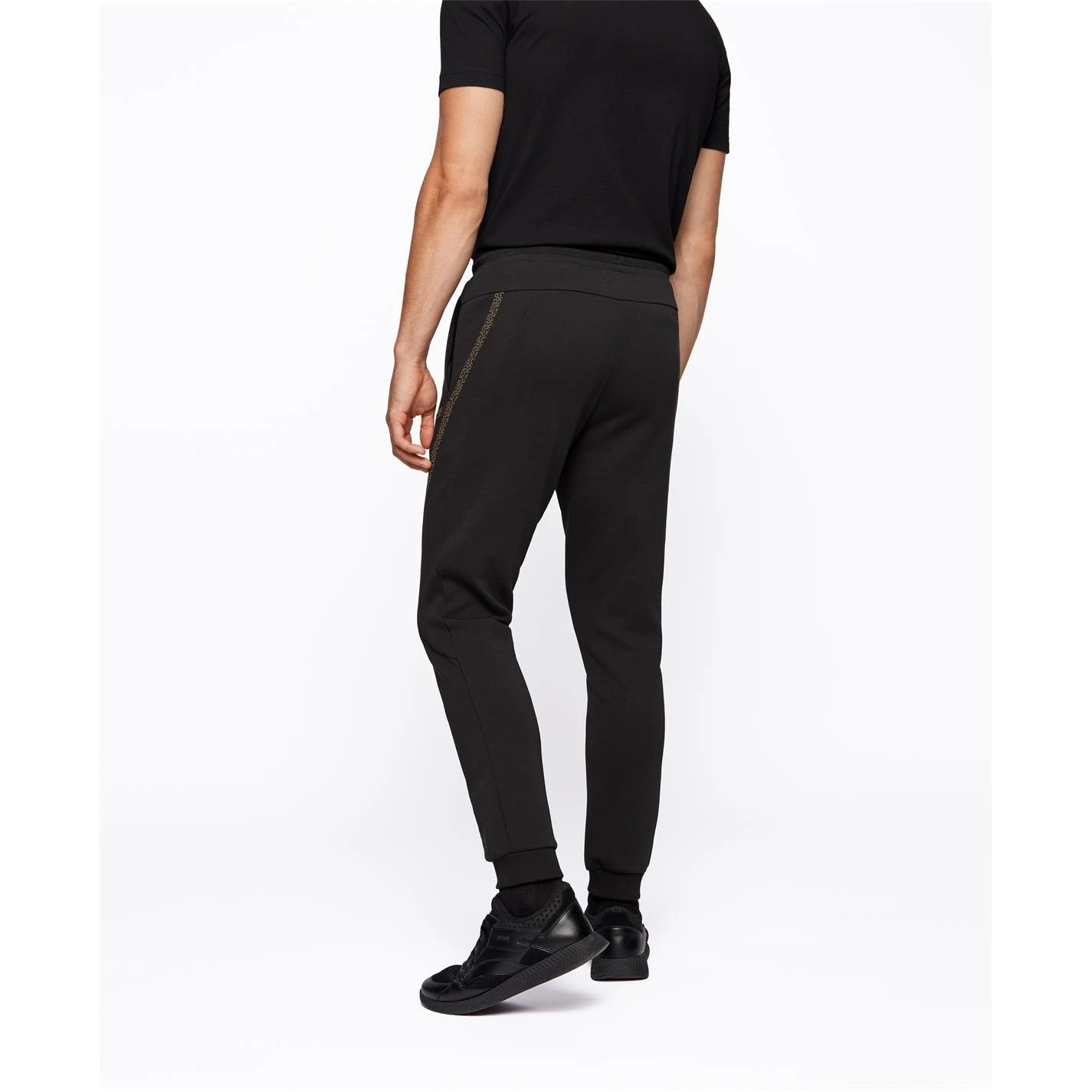 Update your collection with these BOSS Hadiko 2 Jogging Pants. Crafted with an elasticated waistband and drawstring fastening for a secure fit, they feature ribbed cuffs for comfort and two hand pockets for storage. These joggers are designed with a signature logo and are complete with BOSS branding.