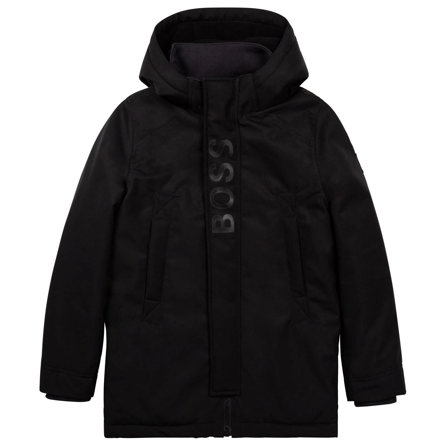 Elevate their collection with this BOSS Hooded Parka Jacket. Crafted with full zip fastening and long sleeves with ribbed trims for a comfortable fit, it features a hooded neckline and two hand pockets for a classic look. This jacket is designed in a solid colouring throughout with a signature logo printed to the centre branding.
