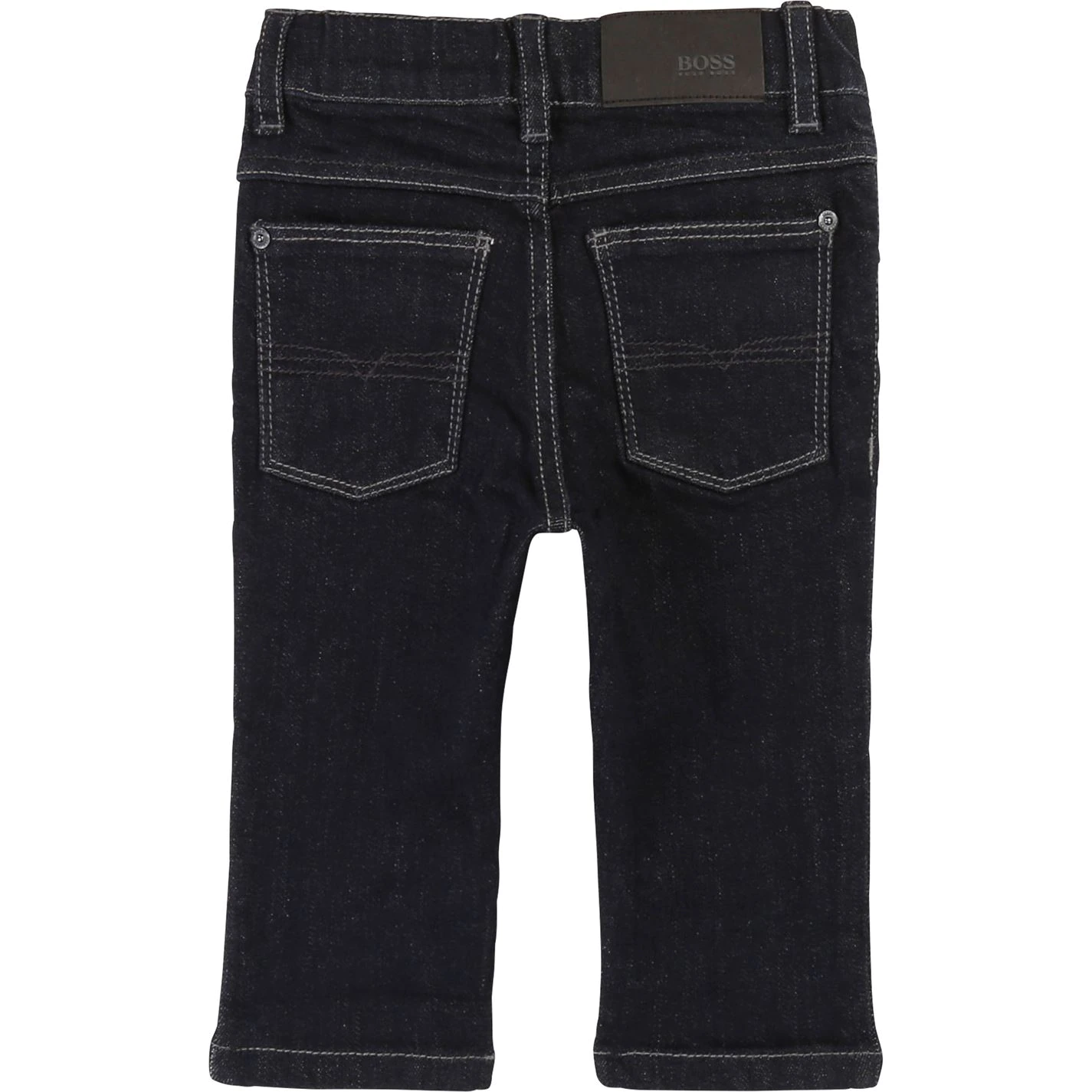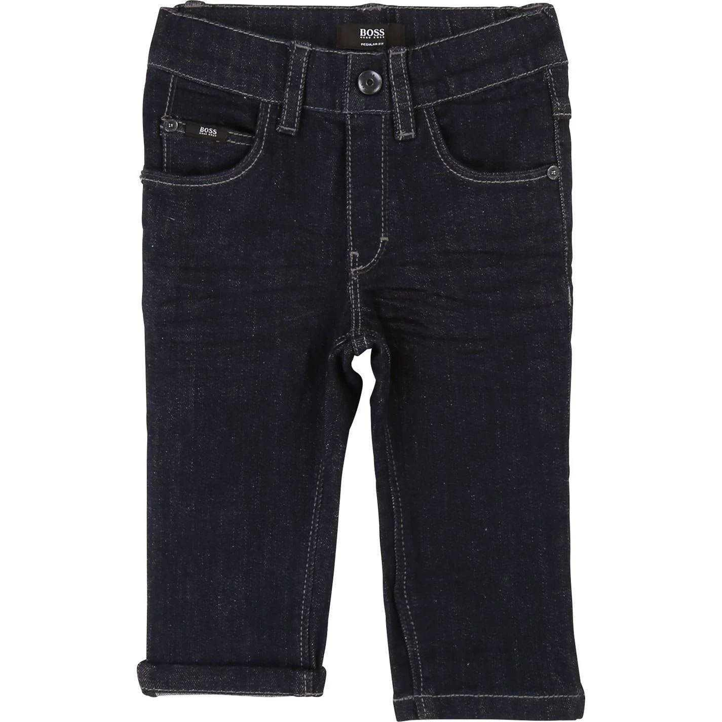 Invest in a quality staple to upgrade your little boy’s holiday look with these jeans by Boss. Crafted from a durable fabric, these denim jeans feature an elasticated waistband that is secured at the front with button and zip closure. Equipped with five pockets, these jeans pair the best with a short-sleeved t-shirt and denim jeans for a stylish look.