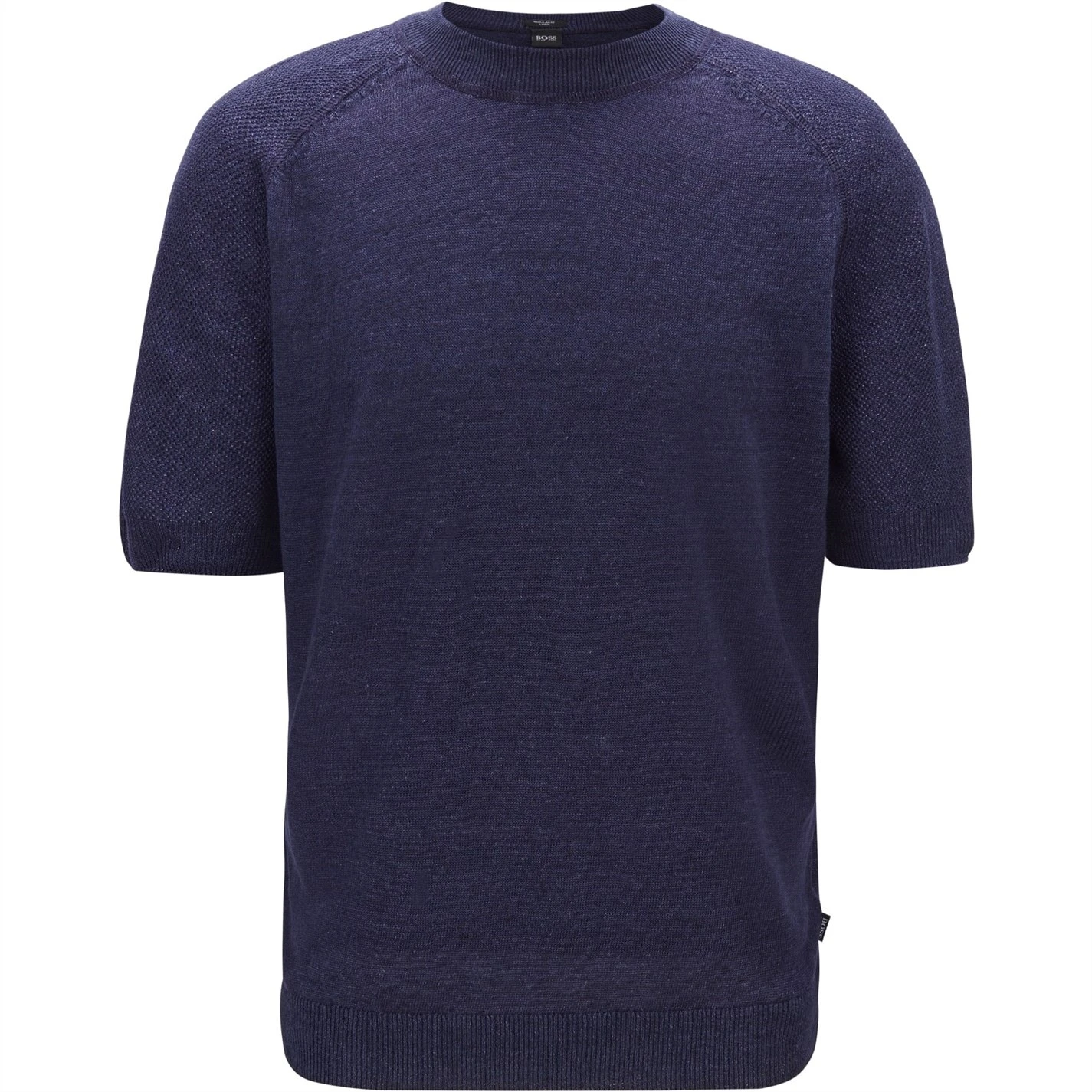 Elevate your collection with this BOSS Julios Knit T Shirt. Crafted with a ribbed crew neckline and short sleeves for a classic look, it features elasticated hems for a comfortable fit. This t shirt is designed with a signature logo and is complete with BOSS branding.
