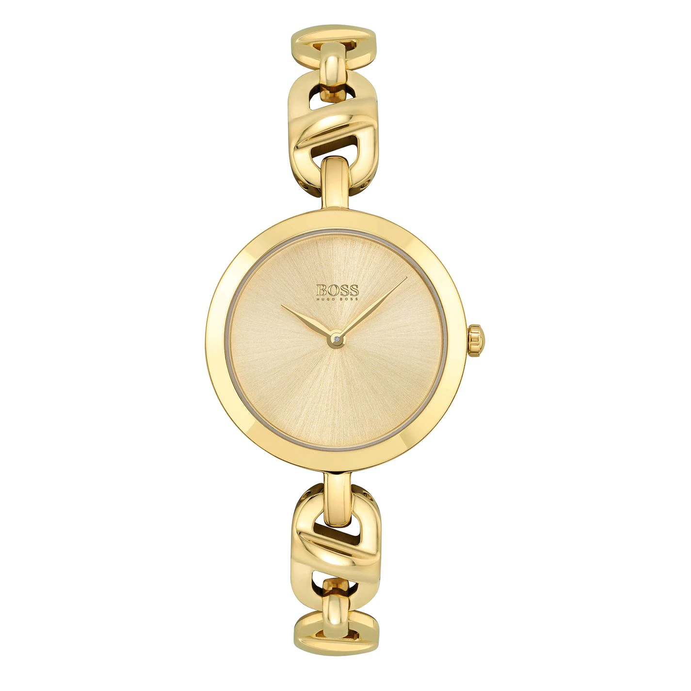 Feminine chic: each delicate BOSS Chain watch can be worn as piece of jewellery in its own right, day or night. Featuring a 28mm light yellow gold IP stainless steel case, light yellow gold dial and light yellow gold IP stainless steel jewellery chain bracelet. Water resistant to 3ATM