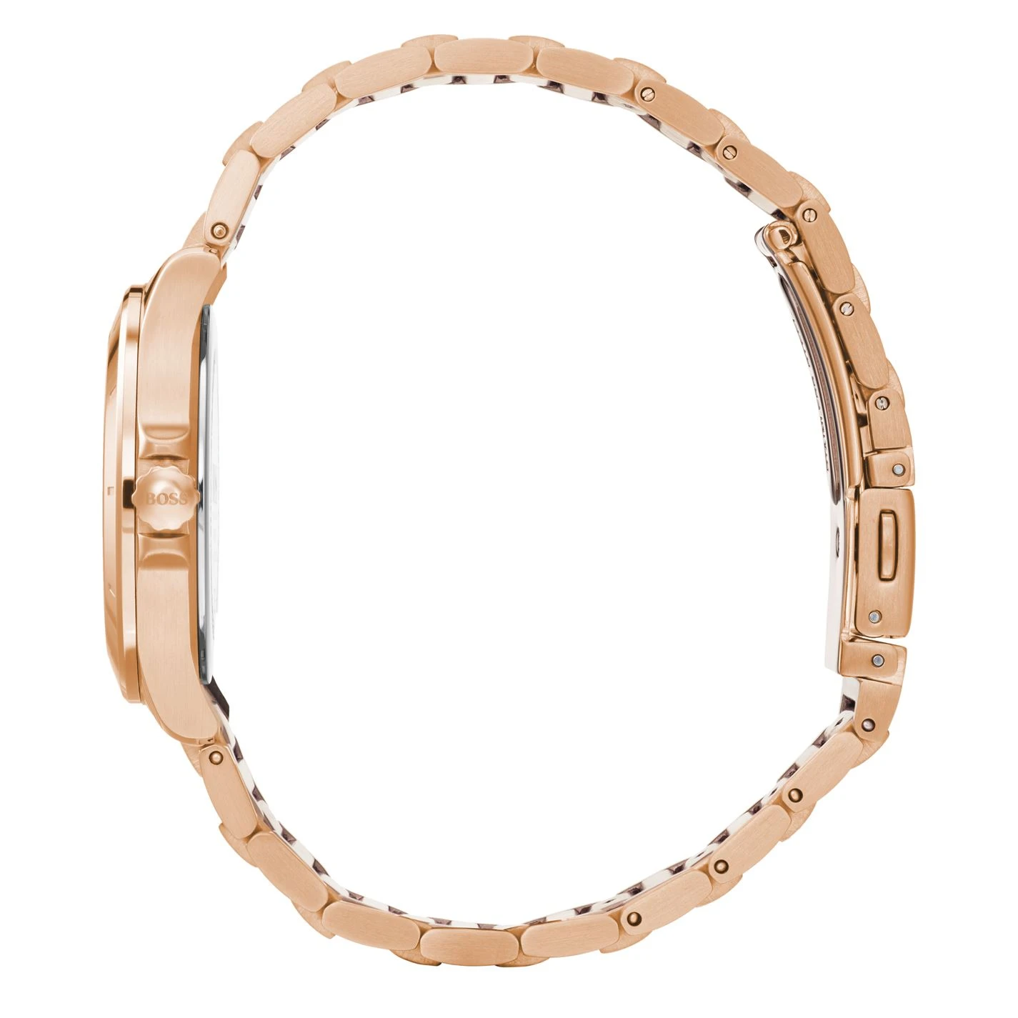 Diamonds are a girl’s best friend, and with the BOSS Diamonds for Her timepiece, she can take them with her wherever she goes.Featuring a 33mm carnation gold IP case, Mother of Pearl dial with diamond markers, carnation gold IP bracelet and push button deployment. Water resistant to 3ATM.