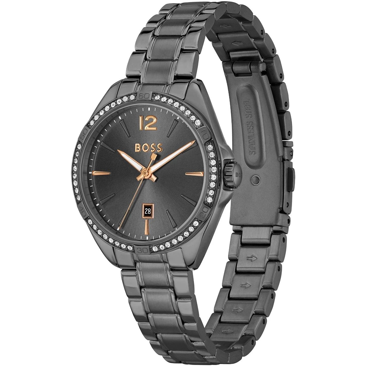 BOSS ladies watch from the Felina family. Featuring a 32mm grey IP stainless steel case with crystal bezel, grey sunray dial and grey IP stainless steel bracelet with push button deployment. Water resistant to 3ATM
