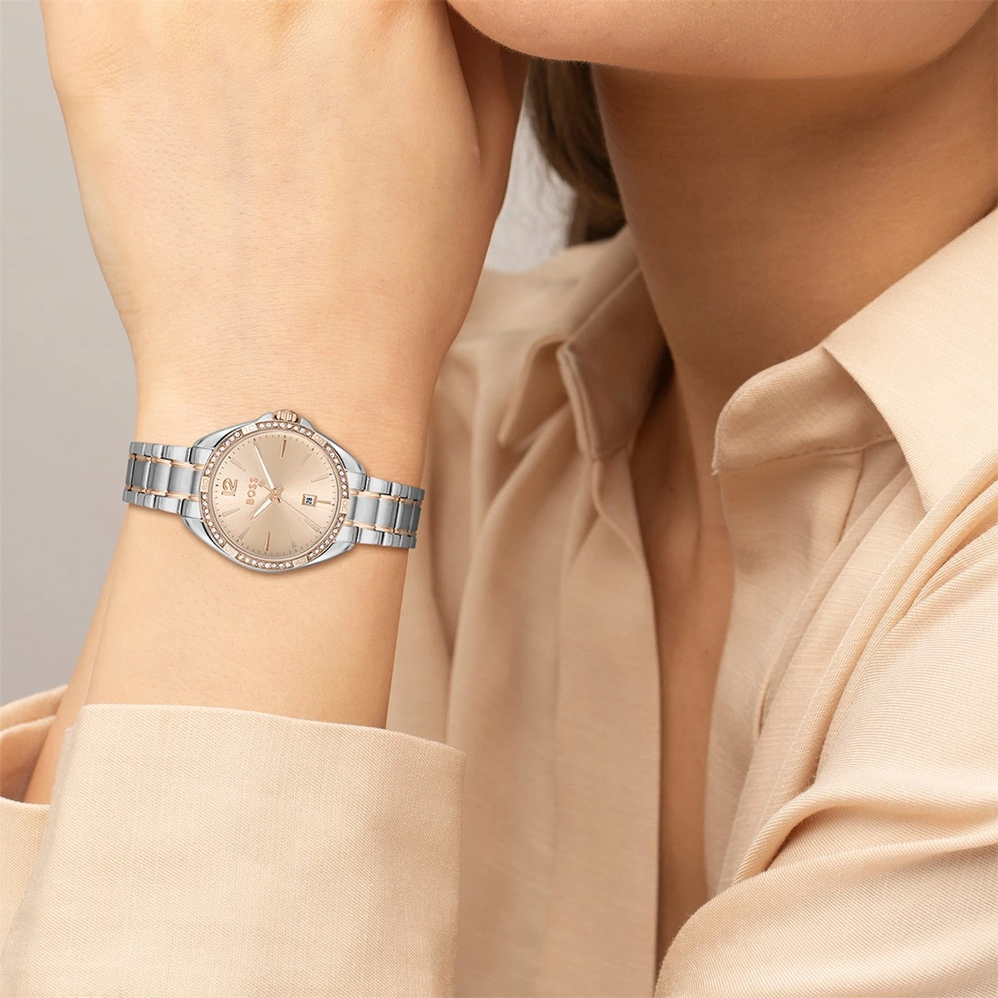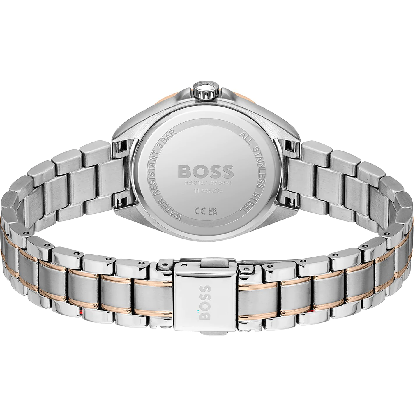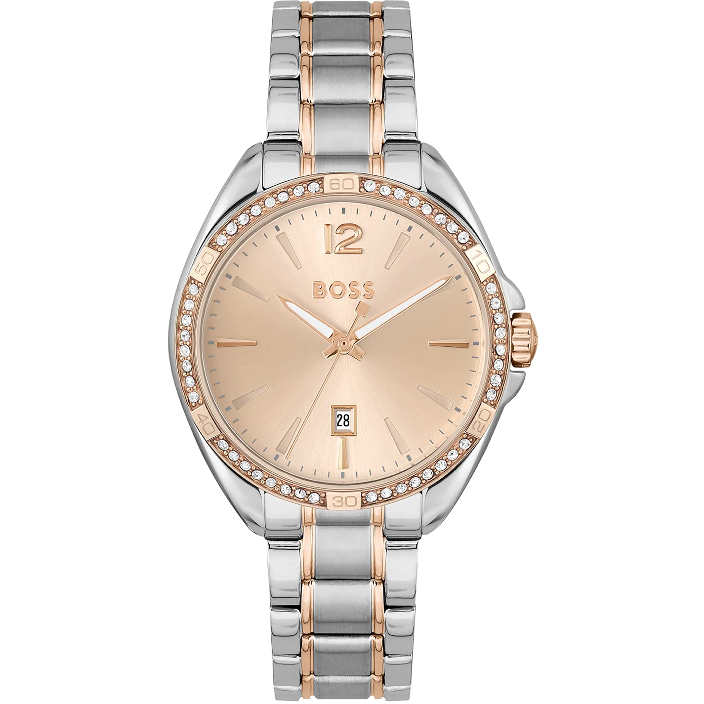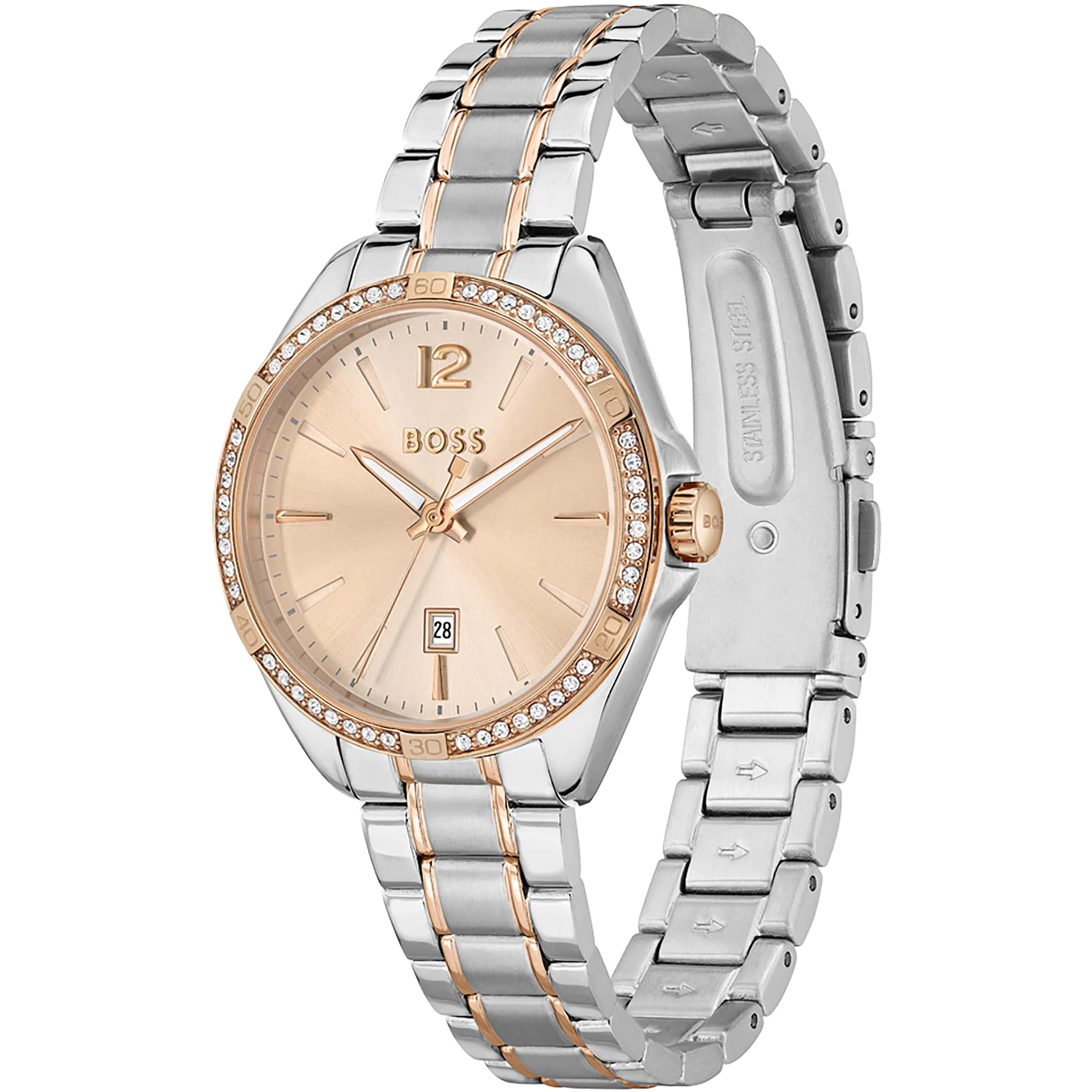 BOSS ladies watch from the Felina family. Featuring a 32mm stainless steel case with carnation gold IP and crystal bezel, champagne sunray dial and stainless steel and carnation gold IP bracelet with push button deployment. Water resistant to 3ATM