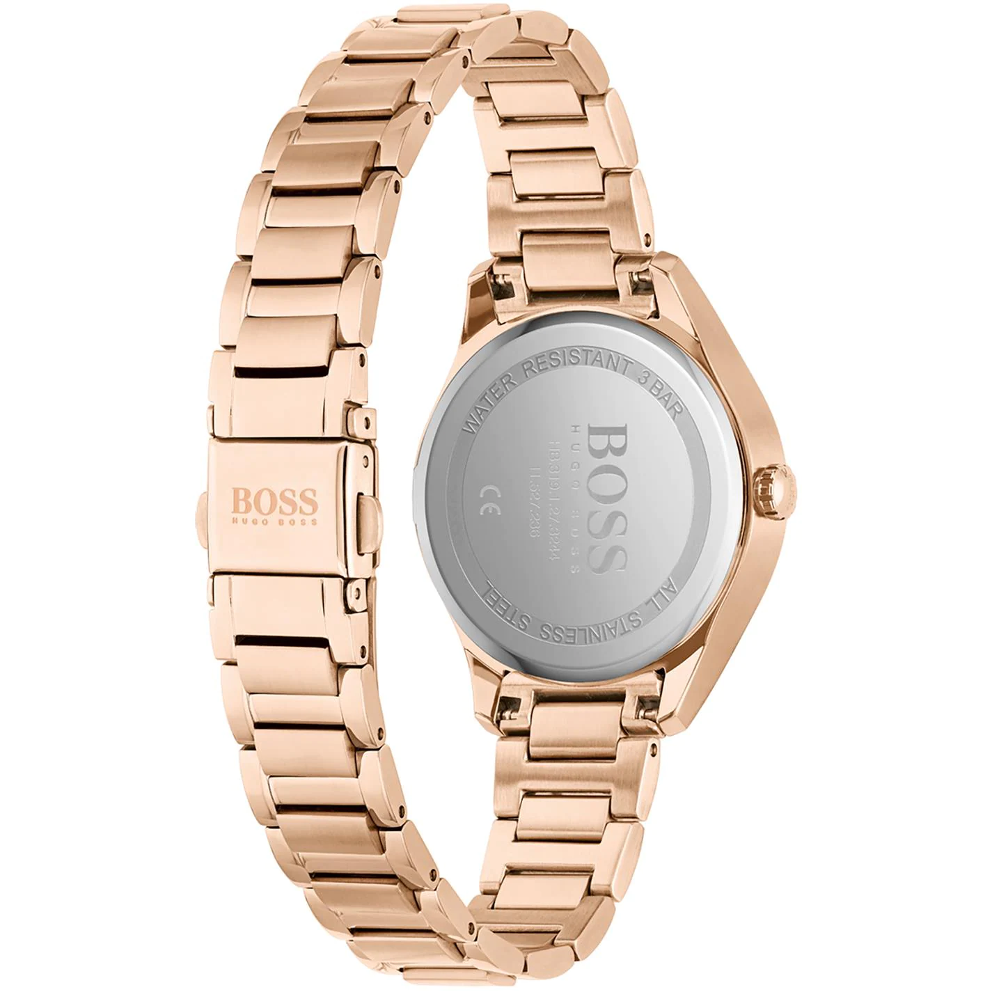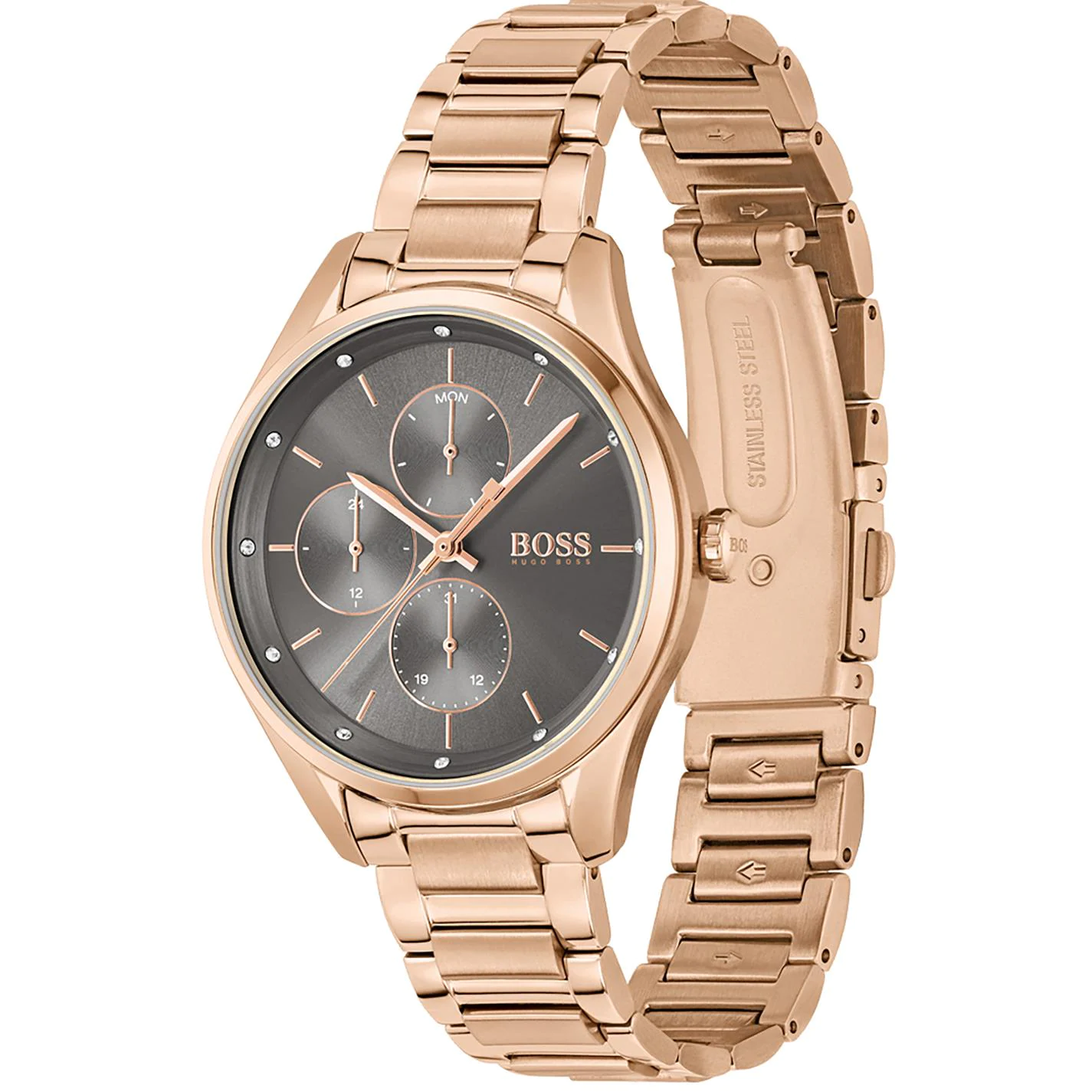Sporty elegance defines the BOSS Grand Course collection. Featuring a 36mm carnation gold IP case, grey sunray dial with crystal detail, carnation gold IP bracelet and push button deployment. Water resistant to 3ATM