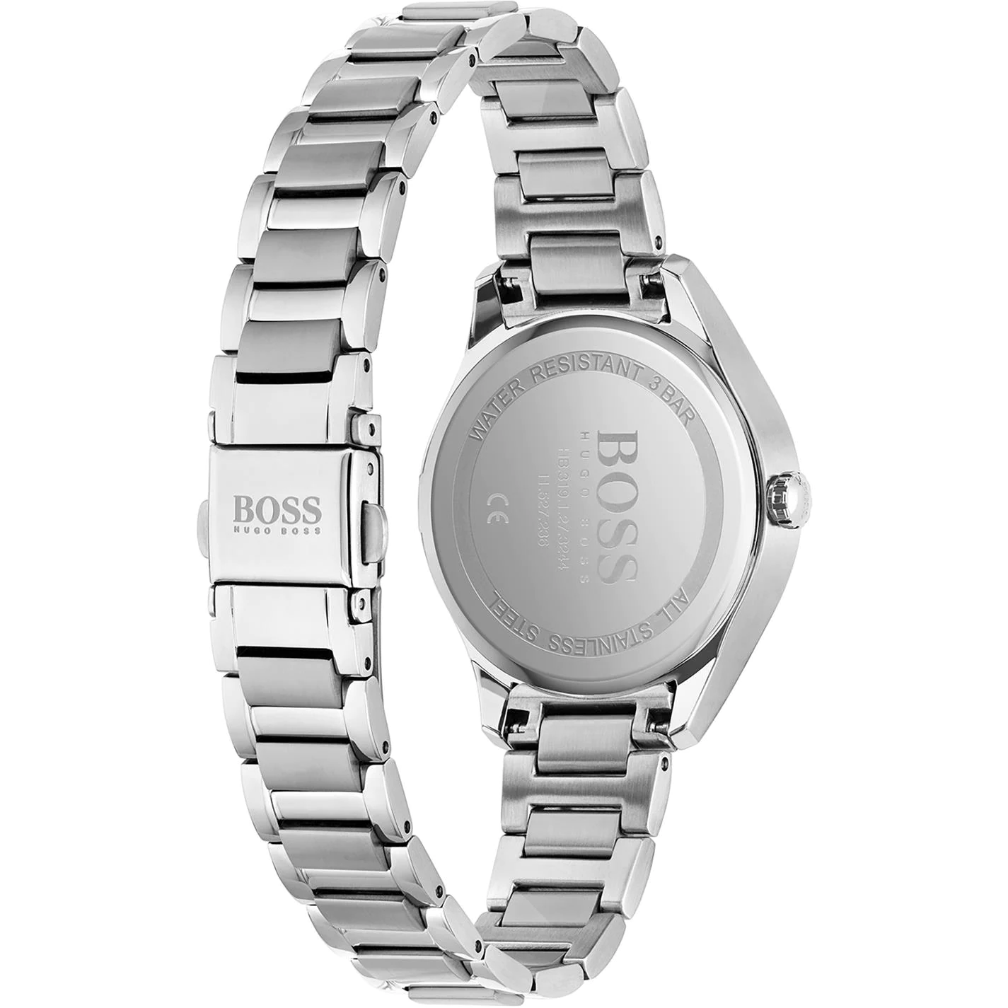 Sporty elegance defines the BOSS Grand Course collection. Featuring a 36mm stainless steel case, sunray dial with crystal detail, stainless steel bracelet and push button deployment. Water resistant to 3ATM.