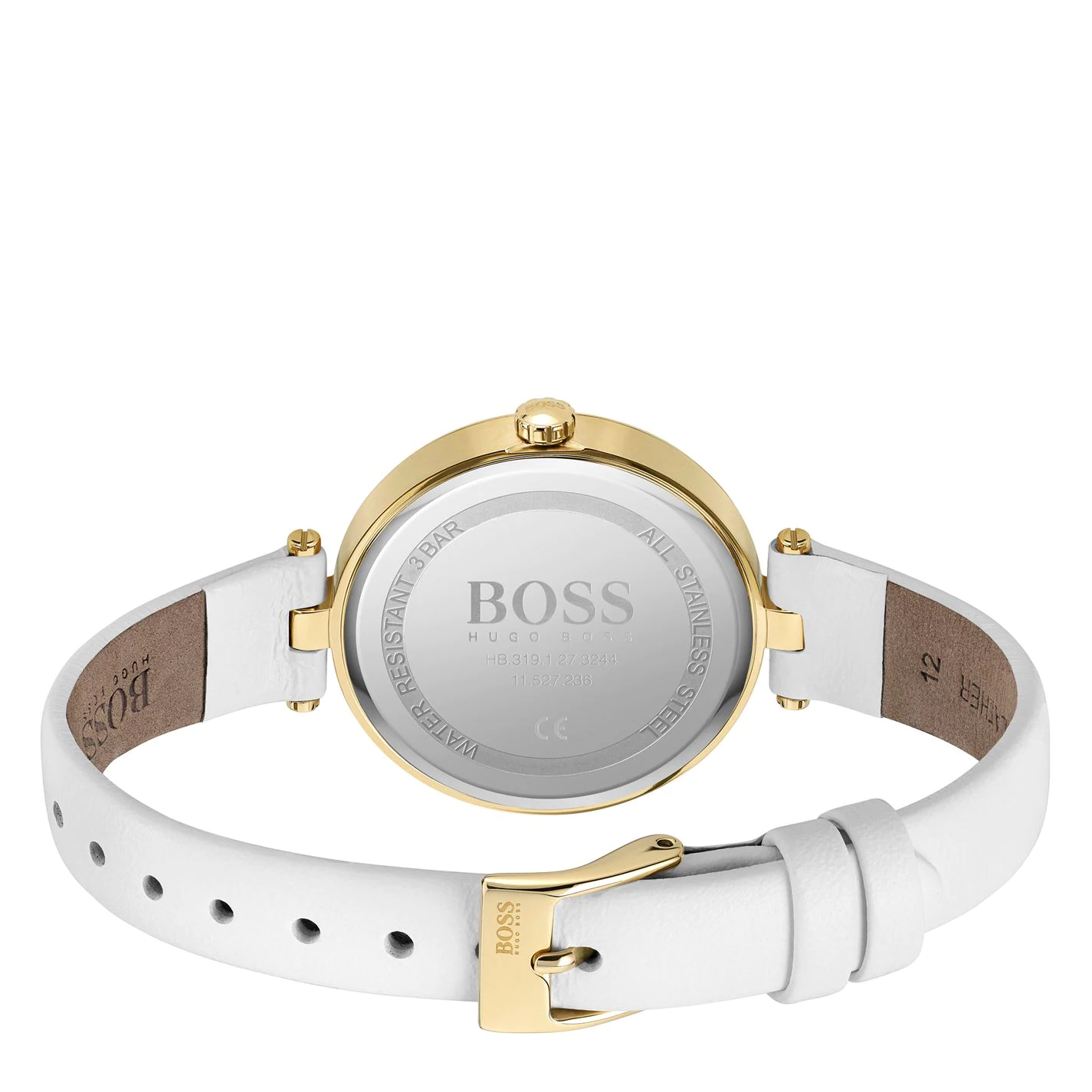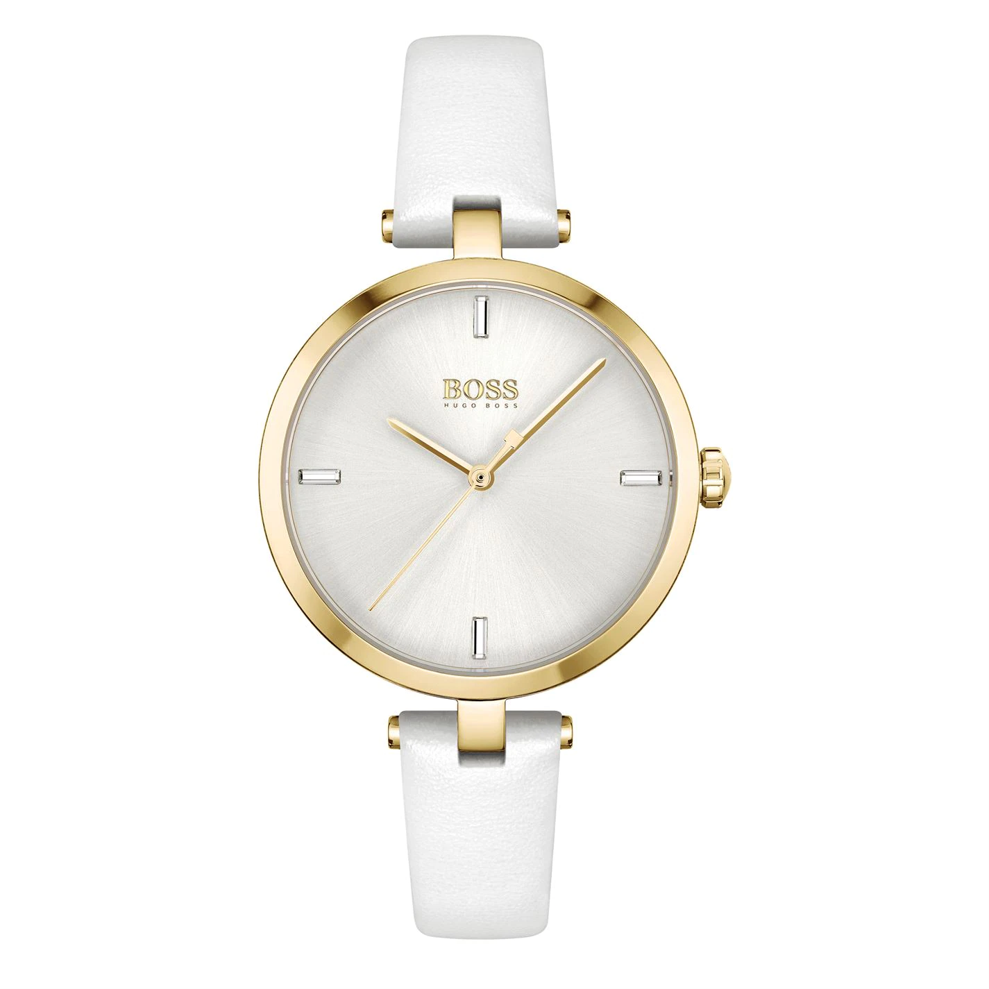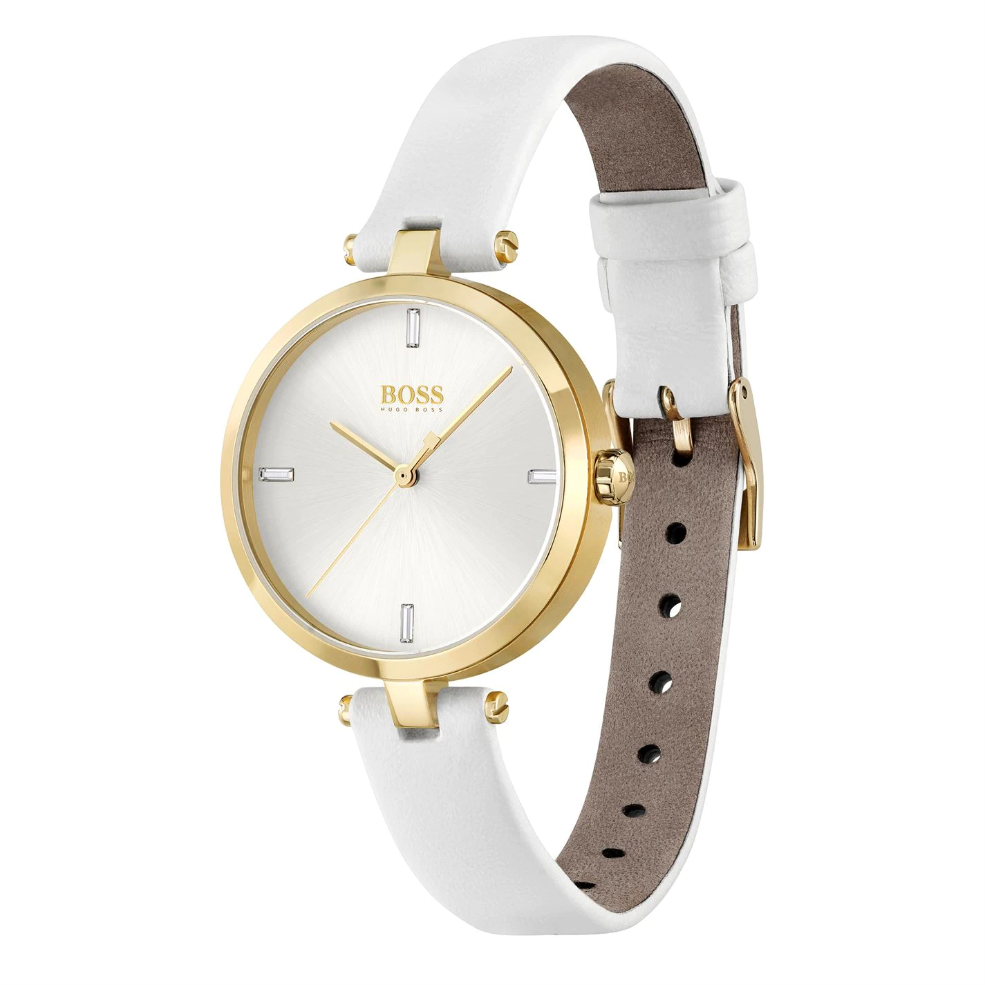 The BOSS woman is going places in style, and the Majesty is set to accompany her on her journey. Featuring a 32mm light yellow gold IP case, silver white dial with four baguette crystal markers and white leather strap. Water resistant to 3ATM