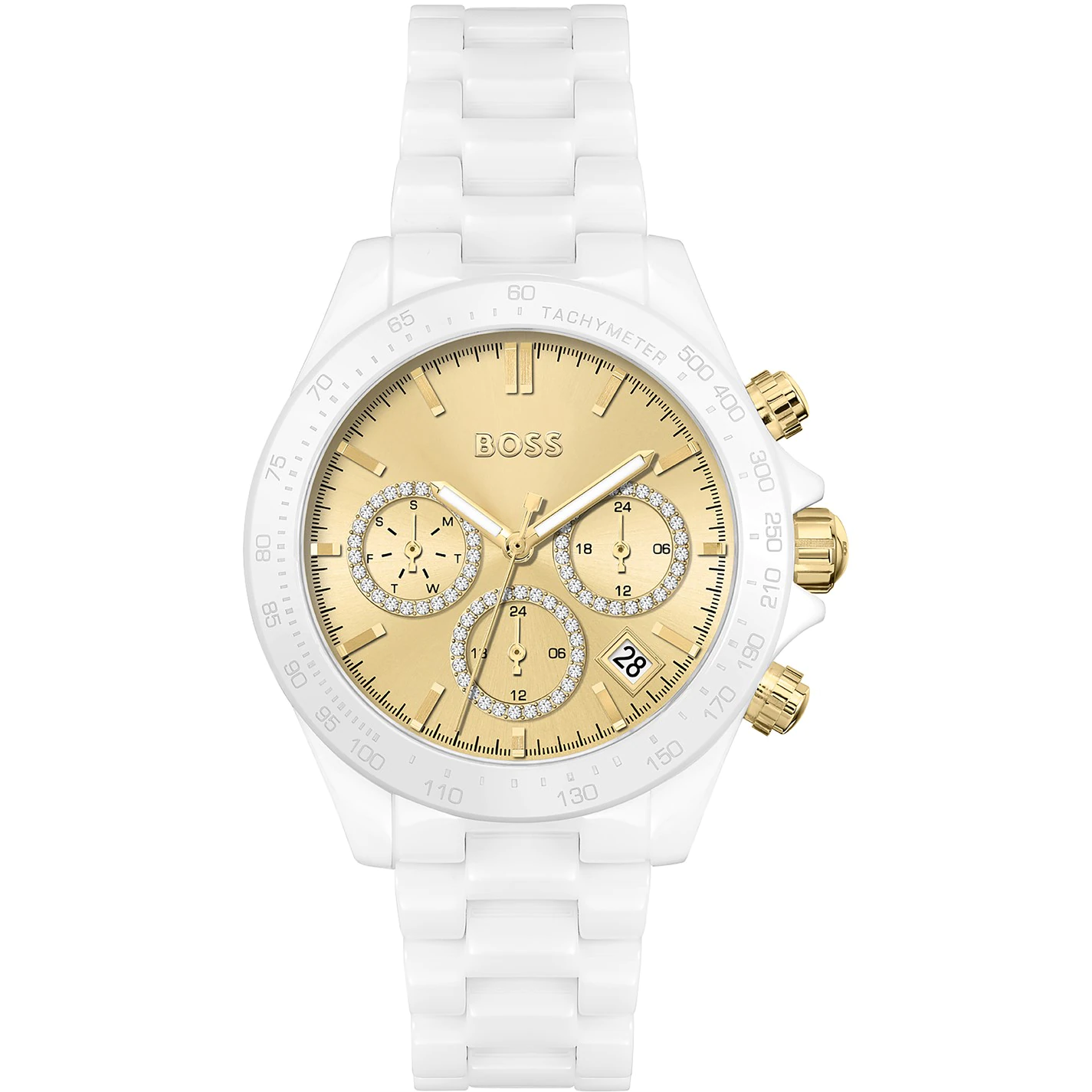 Sporty and chic, the BOSS Novia is a boyfriend-style watch that reflects the confidence and elegance of the BOSS woman. Featuring a 38mm white ceramic case, light yellow gold dial, white ceramic bracelet and push button deployment. Water resistant to 5ATM