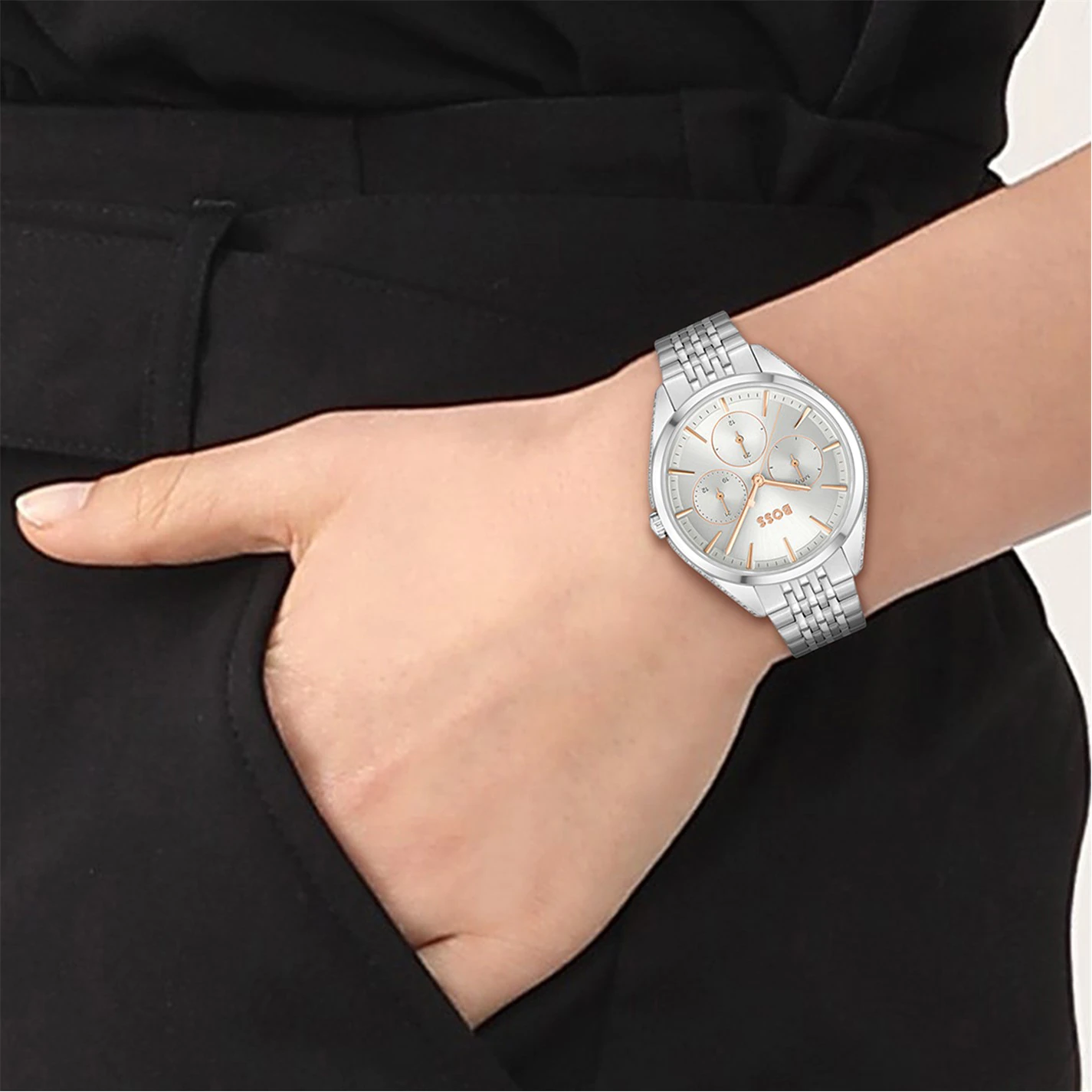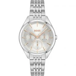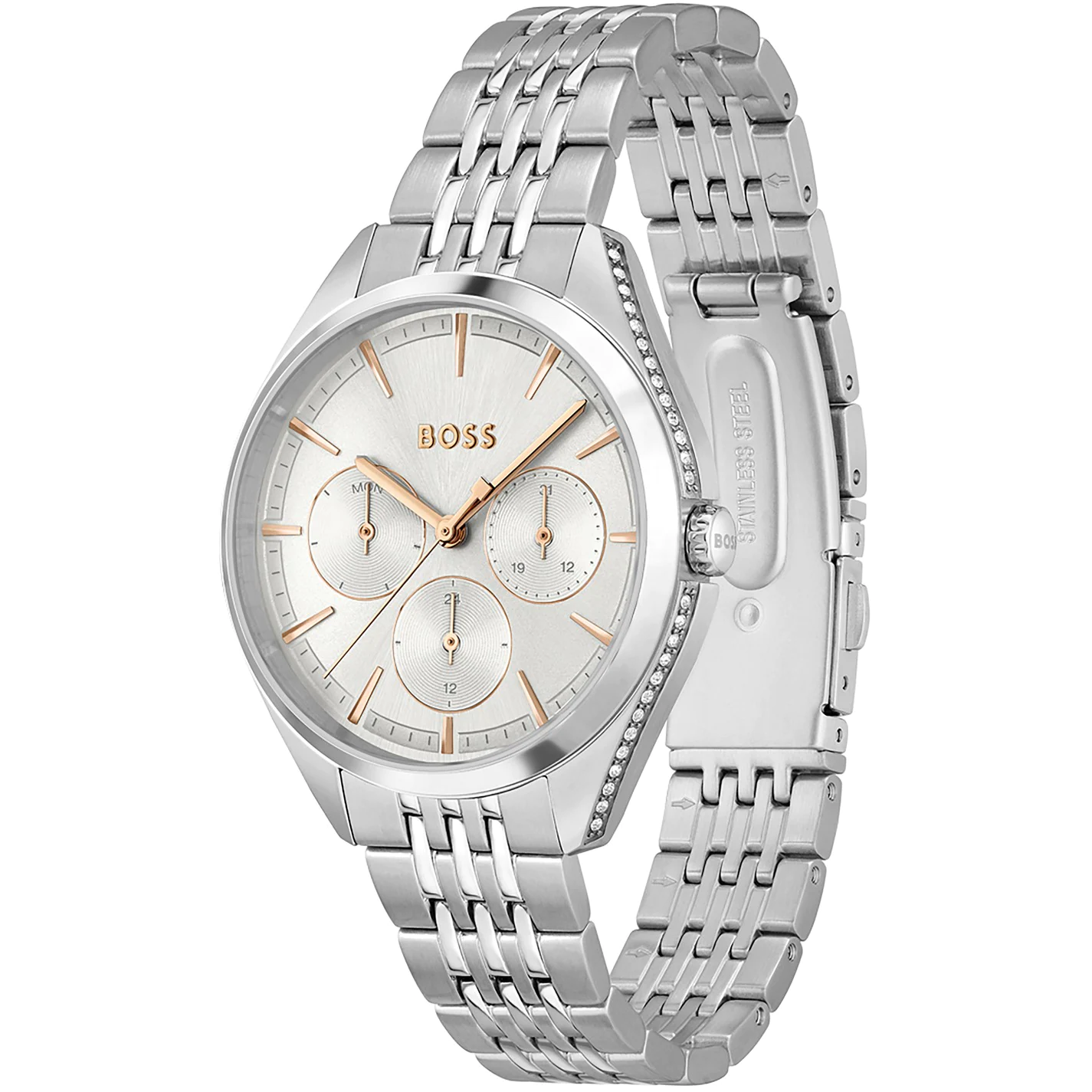 BOSS ladies watch from the Saya family. Featuring a 37mm stainless steel case with crystals, silver white sunray dial and stainless steel bracelet with push button deployment. Water resistant to 3ATM