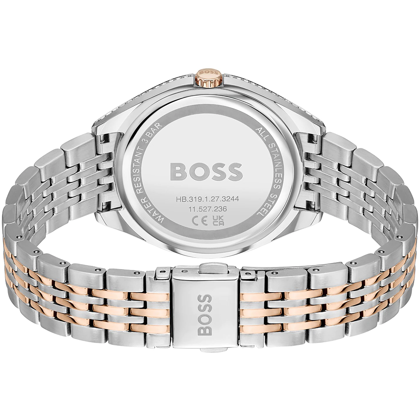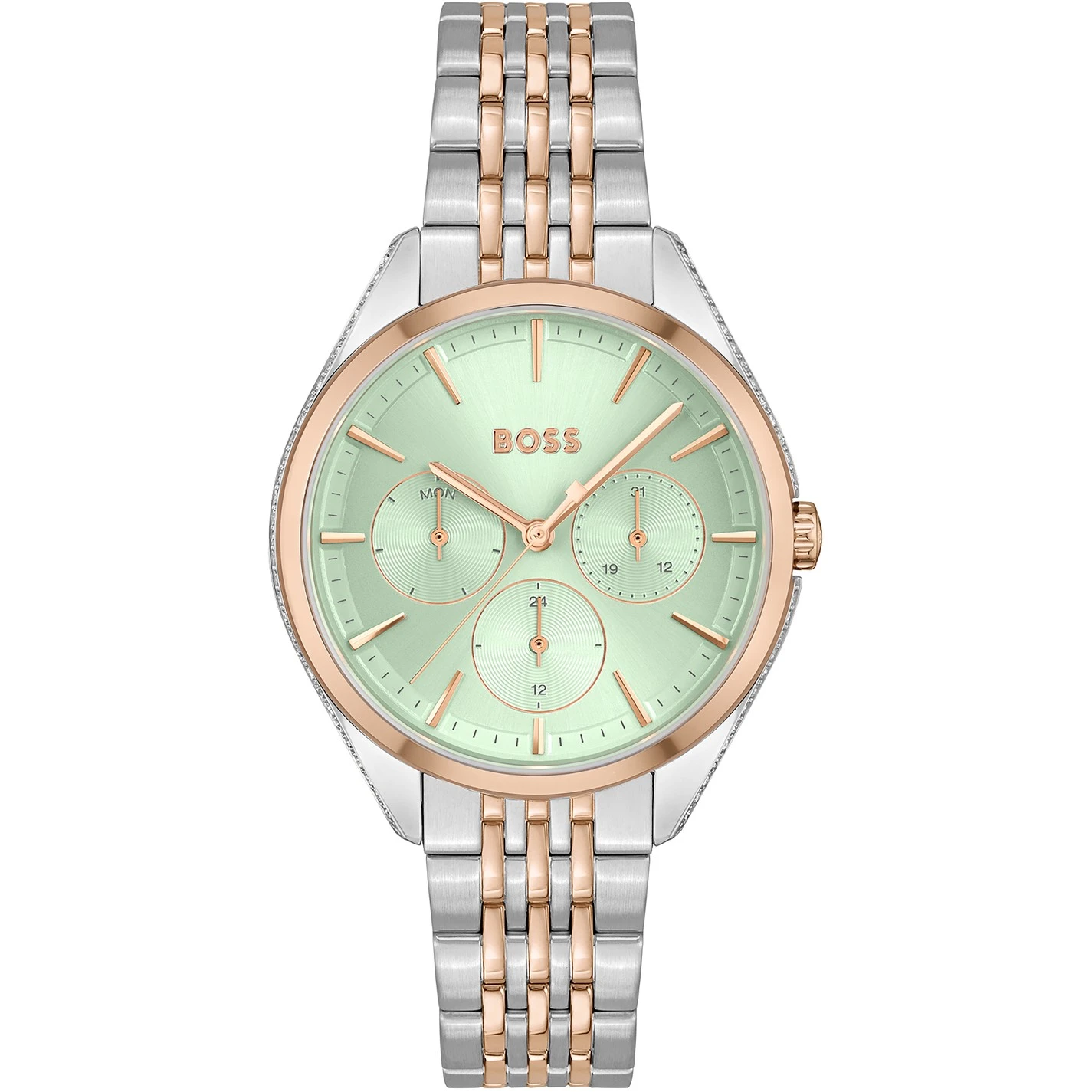 BOSS ladies watch from the Saya family. Featuring a 37mm stainless steel case with crystals, carnation gold IP bezel, green sunray dial and two-tone carnation gold and stainless steel bracelet with push button deployment. Water resistant to 3ATM