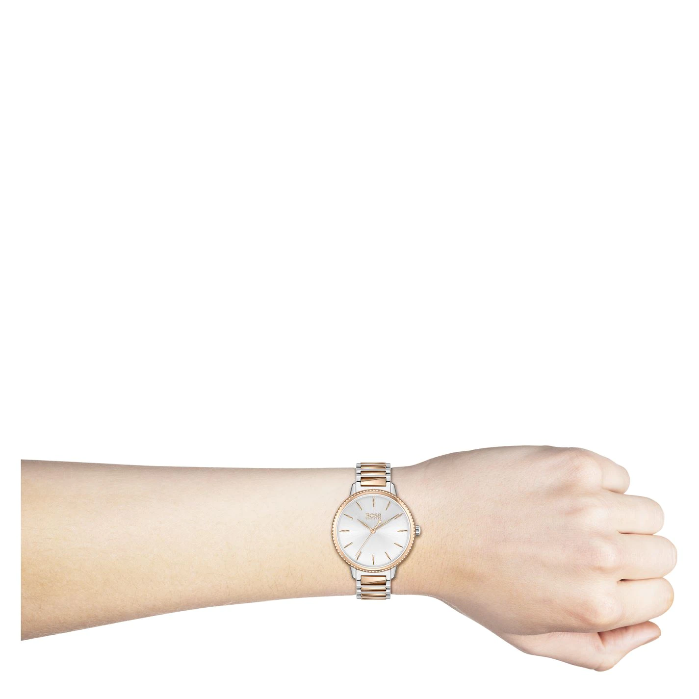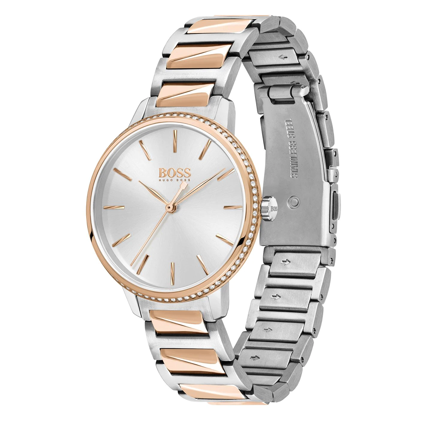 Every woman’s style is her signature. The new BOSS Signature collection embraces this philosophy with a perfect balance of elegance and sparkle. Featuring a 34mm case and bracelet strap. Water resistant to 3ATM.