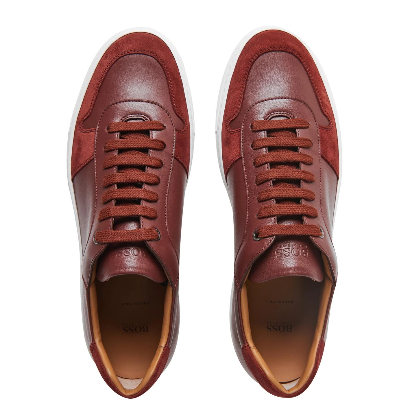 Update your casual ensembles with the Mirage Tennis Trainers from Boss. Crafted in Italy from a smooth leather, this low profile design boats tonal suede trims to the upper with hand-finished burnishings. Secured with a full lace fastening to the upper with a padded tongue and rounded toe, this pair are sat upon a flat rubber sole with tonal stitching for a clean esthetic.