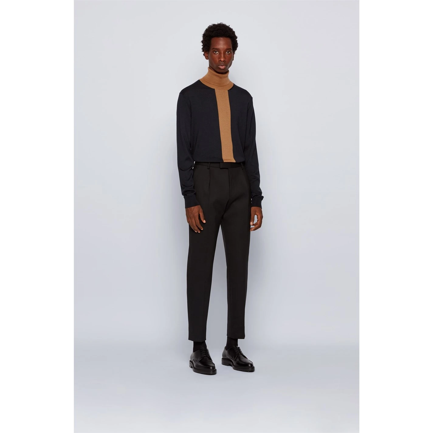 Refresh your collection with this BOSS Montes Jumper. Constructed with long sleeves and a ribbed roll neck for a classic look, it features elasticated hems for a comfortable fit. This jumper is a colour block design with a signature logo and is complete with BOSS branding.