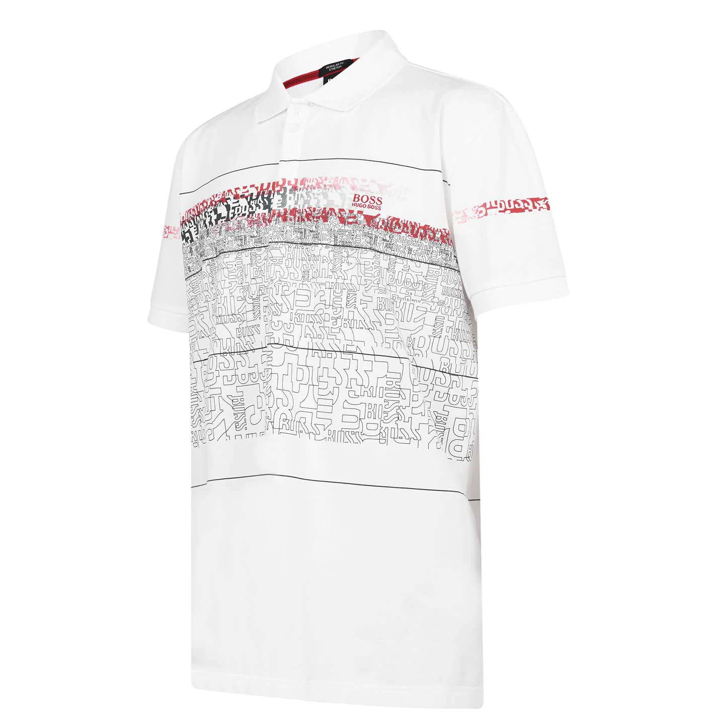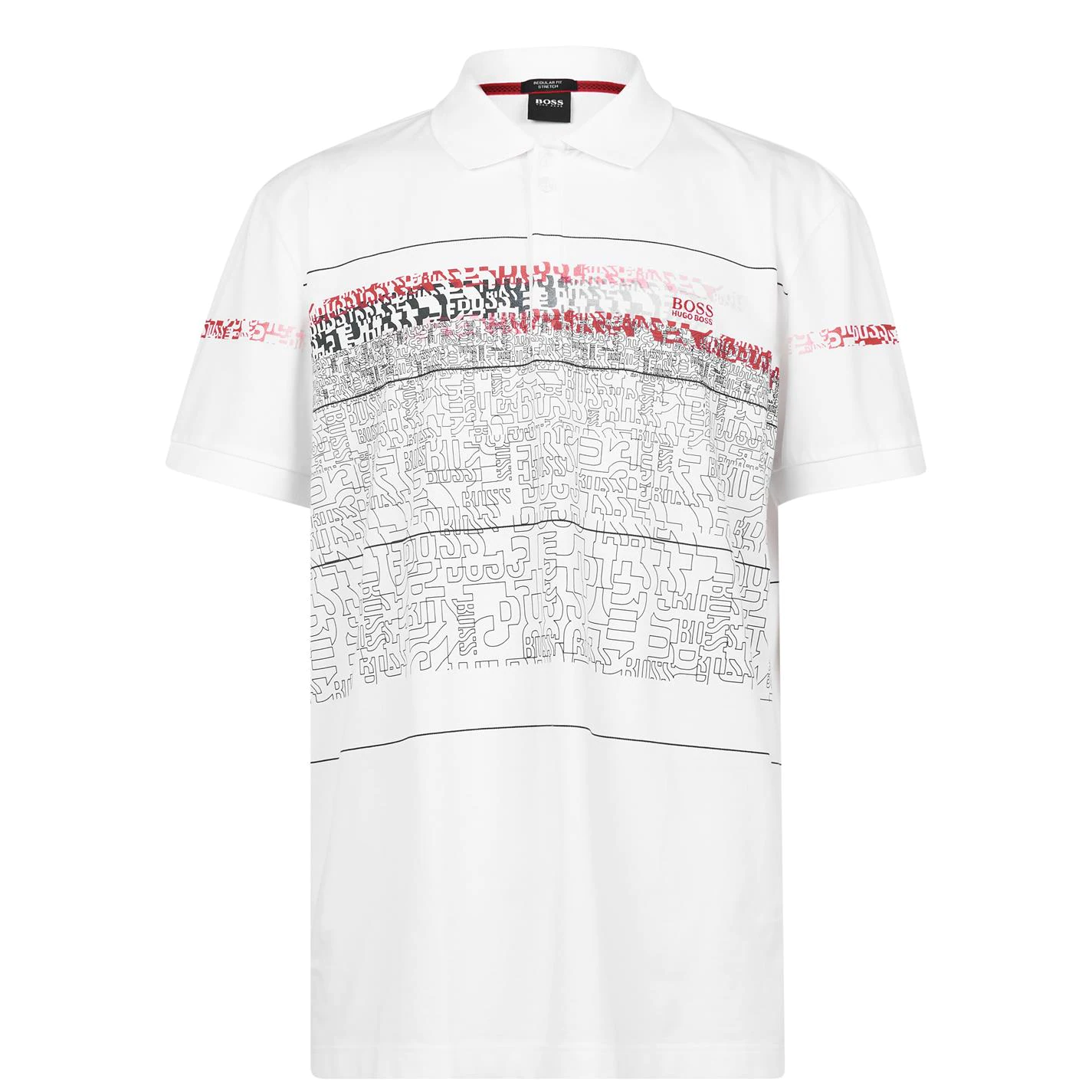 Elevate your everyday collection with this BOSS Paddy 859 Polo Shirt. Crafted with short sleeves and ribbed trims for a comfortable fit, it features a folded collar and a button fastening placket for a classic look. This polo shirt is an all over print design with a signature logo and is complete with BOSS branding for a high end appeal.