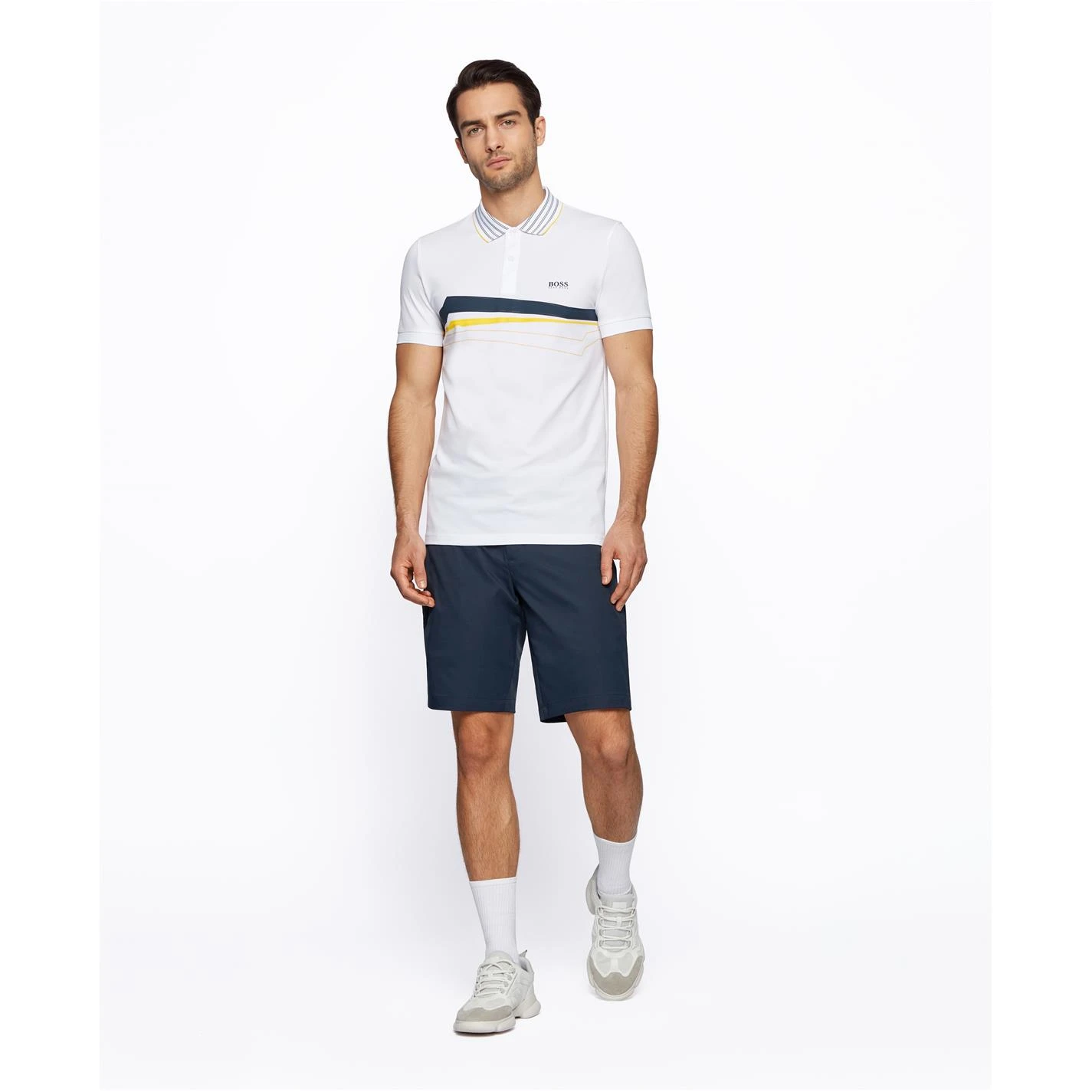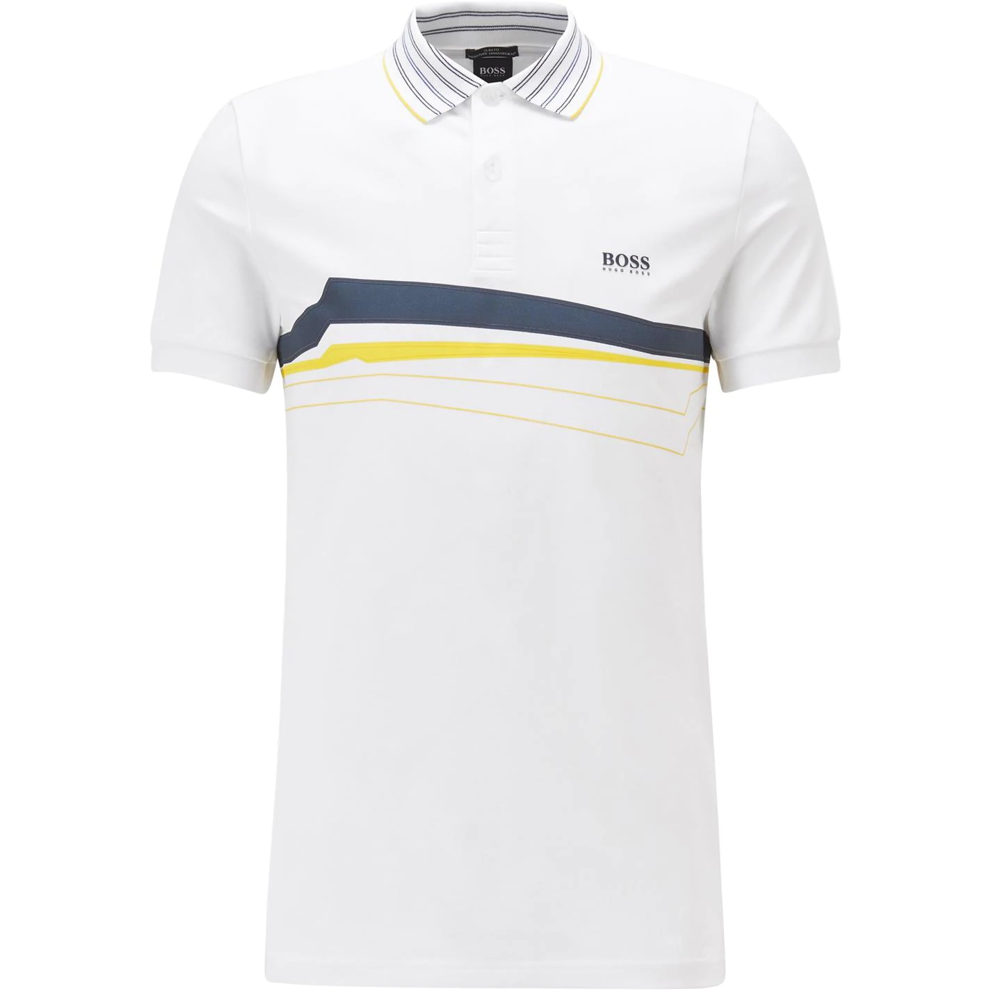 Refresh your collection with this BOSS Paule 8 Polo Shirt. Constructed with short sleeves and ribbed trims for a comfortable fit, it features a folded collar and a two button fastening placket for a classic look. This polo shirt is designed with graphic detailing as well as a signature logo and is complete with BOSS branding.