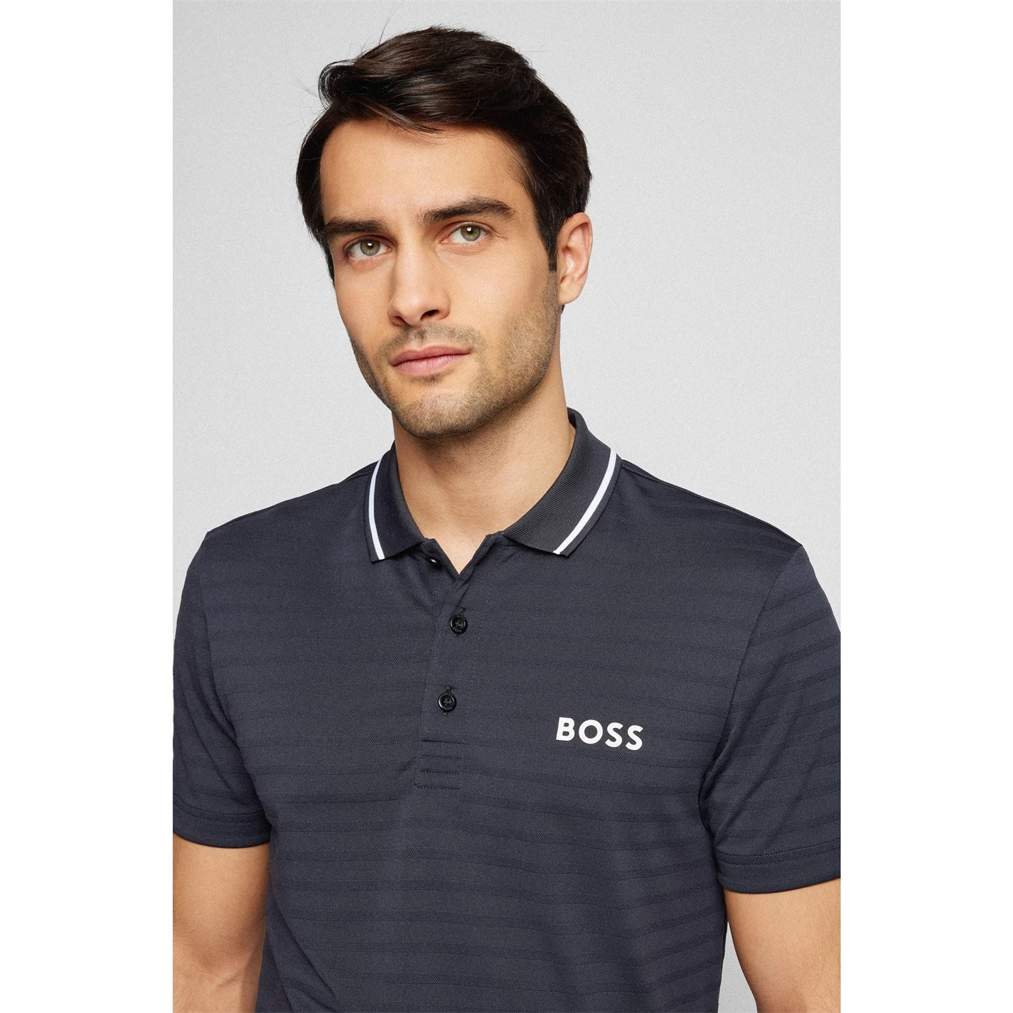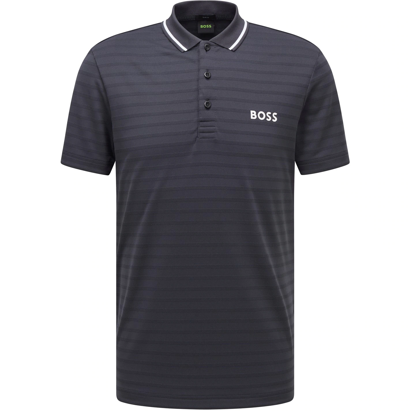 Update your golfing essentials with the Boss Pauletech Polo Shirt. Whilst constructed with a polyester material in a slim fit, this tee features a classic polo collar with 3 button fastening, short sleeves and open trims for a classic look. Decorated in a striped patterning throughout with a contrasting piped trim to the collar, the piece is finished with the Boss logo presented on the front.