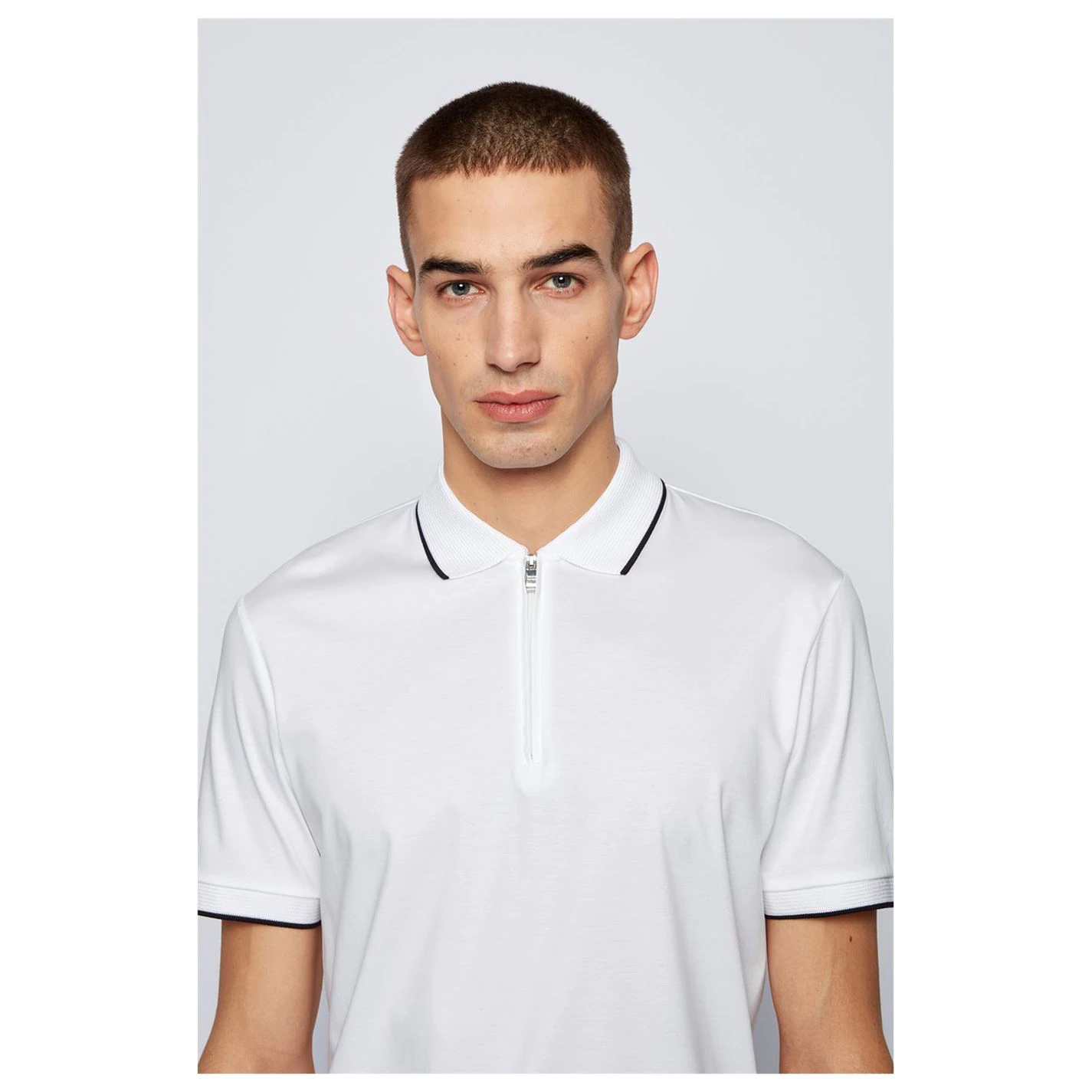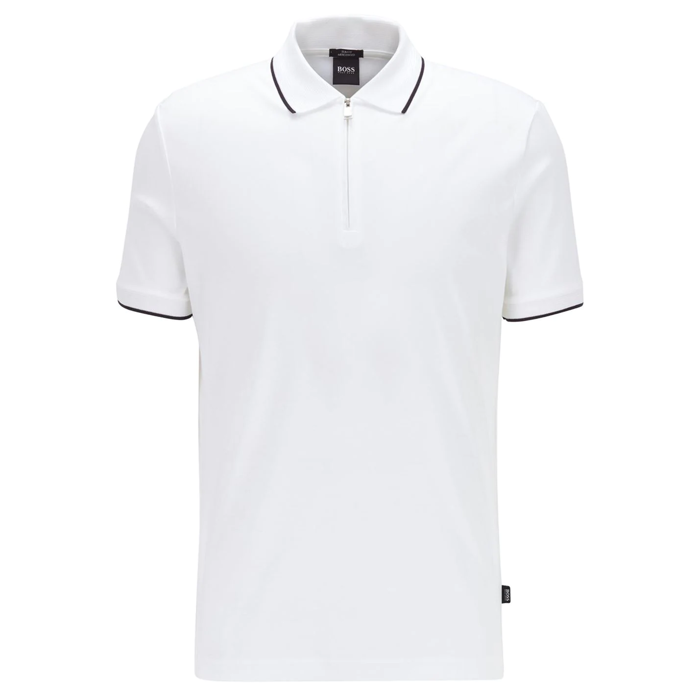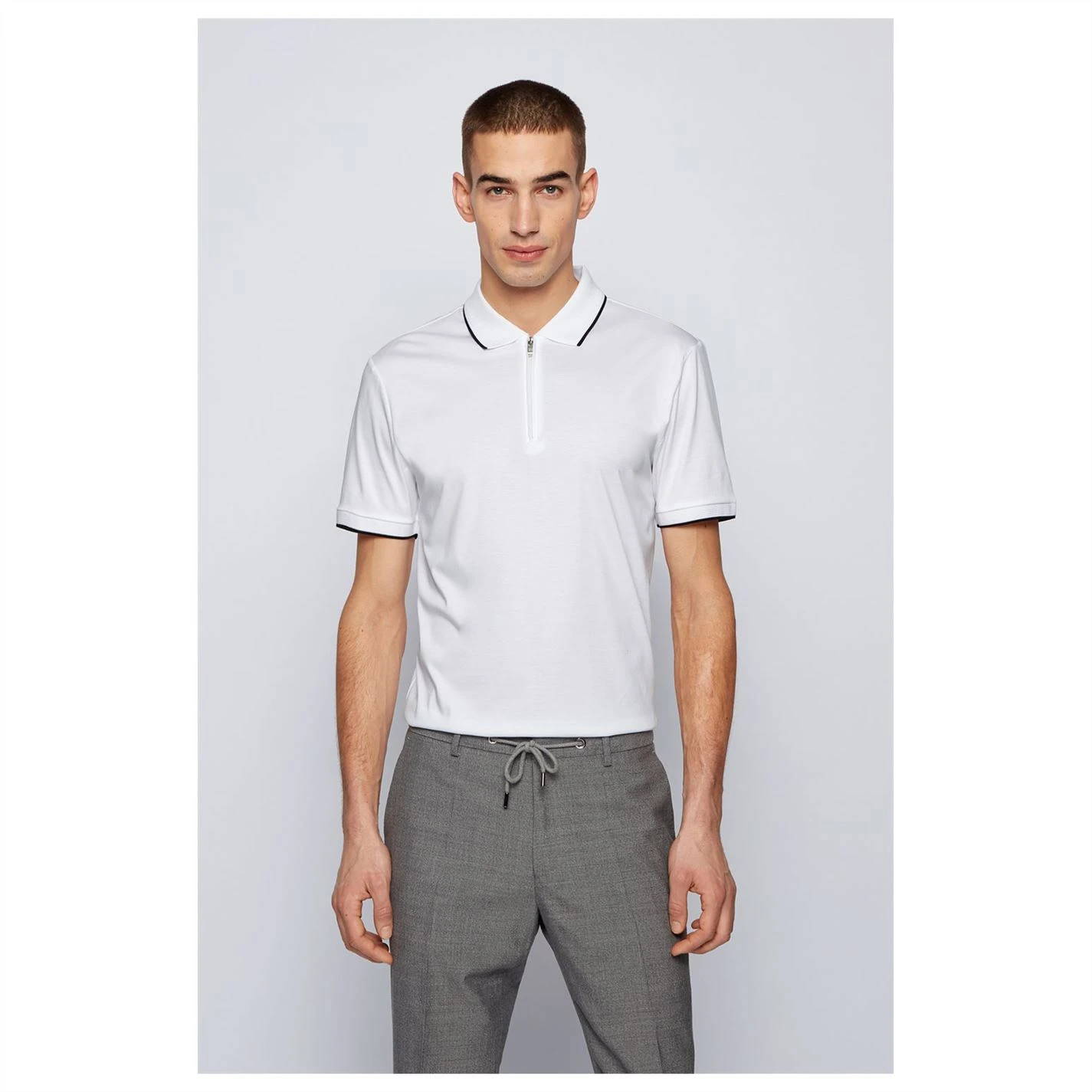 Enhance your collection with this Boss Polston 20 Zip Polo Shirt. Constructed with a folded collar and half zip fastening for a secure fit, it features short sleeves for a classic look. This polo shirt is designed with a signature logo and is complete with Boss branding.