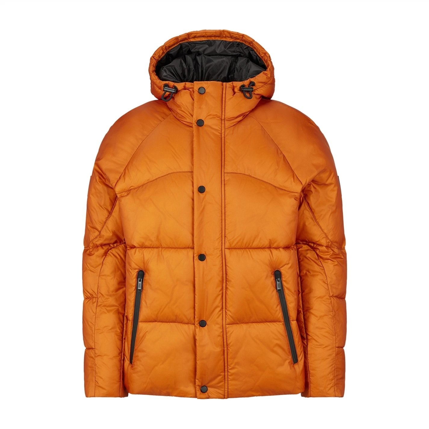 Designed to become a staple during winter, this jacket has been crafted from a durable Nylon fabrication filled with a lightweight synthetic padding for a warm puffer construction. Adorning a contrasting coloured lining, this garment styles an attached hooded neckline with toggle fastenings for an adjustable fit. Compete with a full zip fastening concealed with a front snap button closure, this essential layering piece offers two zipped pockets adorned with ribbed cuffs to the long sleeves. The look is complete with a branded logo patch to the upper sleeve for a designer appeal.