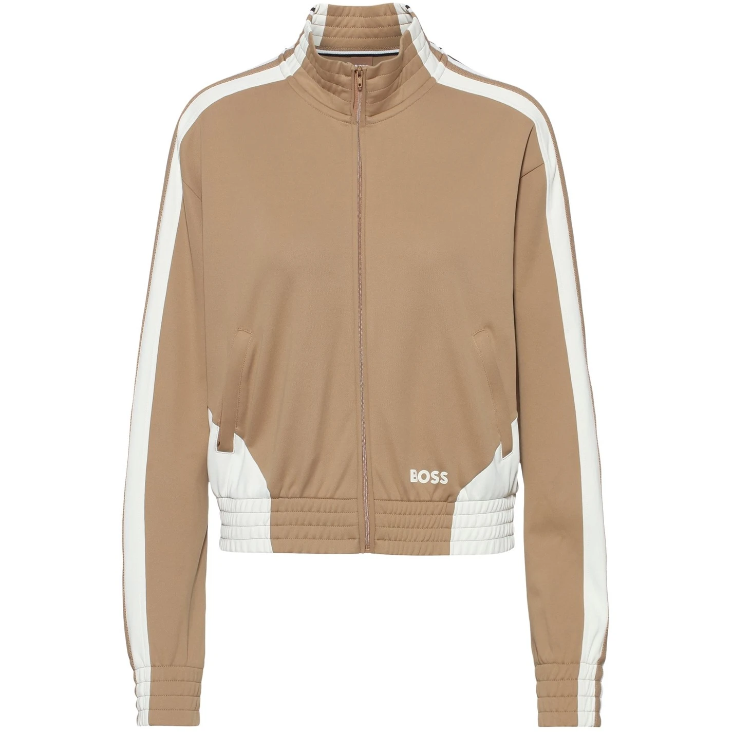 With an athleisure-wear aesthetic, this regular fit silhouette has been crafted from a blended cotton for a lightweight feel boasting a colour-blocked design defined with contrasting stripes for a sporty finish. Styled with a funnel neckline, full zip fastening and an elasticated hem, this garment features two slip pockets with further elasticated cuffs to the long sleeves. The look is signed off with a small Boss logo printed to the hem perfect to style with track bottoms and trainers.