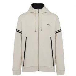 This BOSS hoodie is elevated with a sporty design and contrast sleeve and side detailing making it a great addition to your wardrobe. An adjustable hood offers protection in wet conditions, a full zip front allows the hoodie to be worn open or closed and look equally as good. Featuring two hand pockets, contrast hood lining with ribbed cuffs and waist. The look is finalised with a BOSS embossed to the left of the chest for instant brand recognition. Material, 80% cotton, 15% polyester, 5% elastane. Hood lining, cotton. Machine washable at 30 degrees.