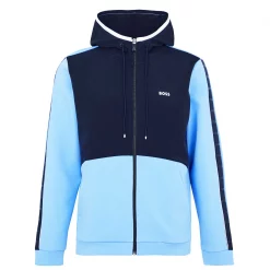 Add something new to your casual outfit selection with the Saggy Zip Hoodie by Boss, crafted from a soft, cotton-blend fabric that offers all-day comfort and enough stretch for ease of movement. The hoodie features full zip fastening to the front, slight stand-up collar, drawstrings to the hood to adjust the fit, split kangaroo pocket to the front and long sleeves with ribbed cuffs and hem. The look is completed by colouring block colouring throughout, signature logo to the front and tape logo detailing to the sleeves for instant designer appeal.