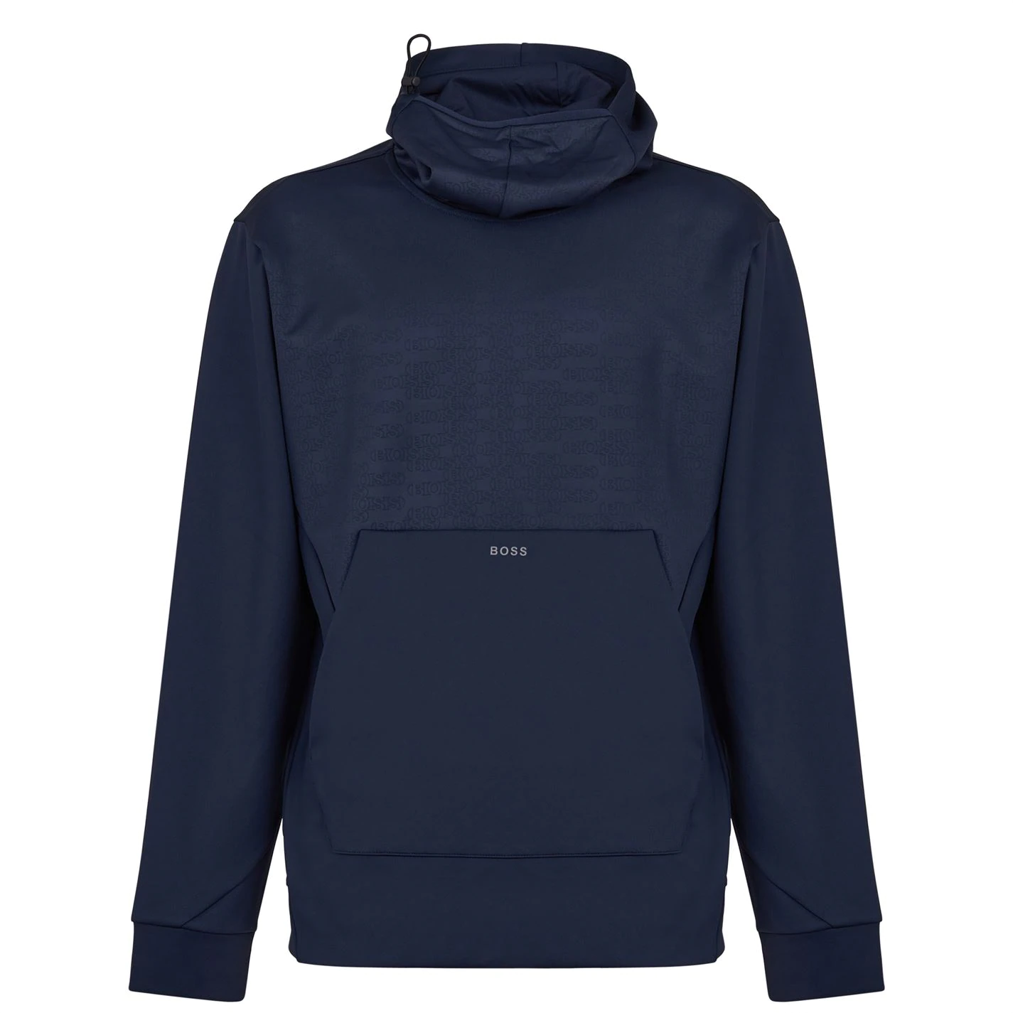 Add some unique style to your casual attire with this versatile Sancon Hoodie by BOSS. Crafted from recycled polyester and elastane mix fabric for a comfortable and stretch design providing ease of motion, perfect for an active lifestyle. Cut with S.Cafe fabric to provide an exceptional wearing comfort combined with fast drying and odour control. The regular fit hoodie features a concealed hood and hooded neckline with adjustable toggle to keep you warm in style. Ribbed cuffs, waist and a large kangaroo pocket to keep your hands warm. The look is complete with the BOSS logo embossed over the collar hood, upper chest and a contrast BOSS logo embossed on the front pocket for instant brand recognition. Material, 88% polyester, 12% elastane. Accessory, polyester. Pocketing, polyester. Machine washable at 30 degrees.