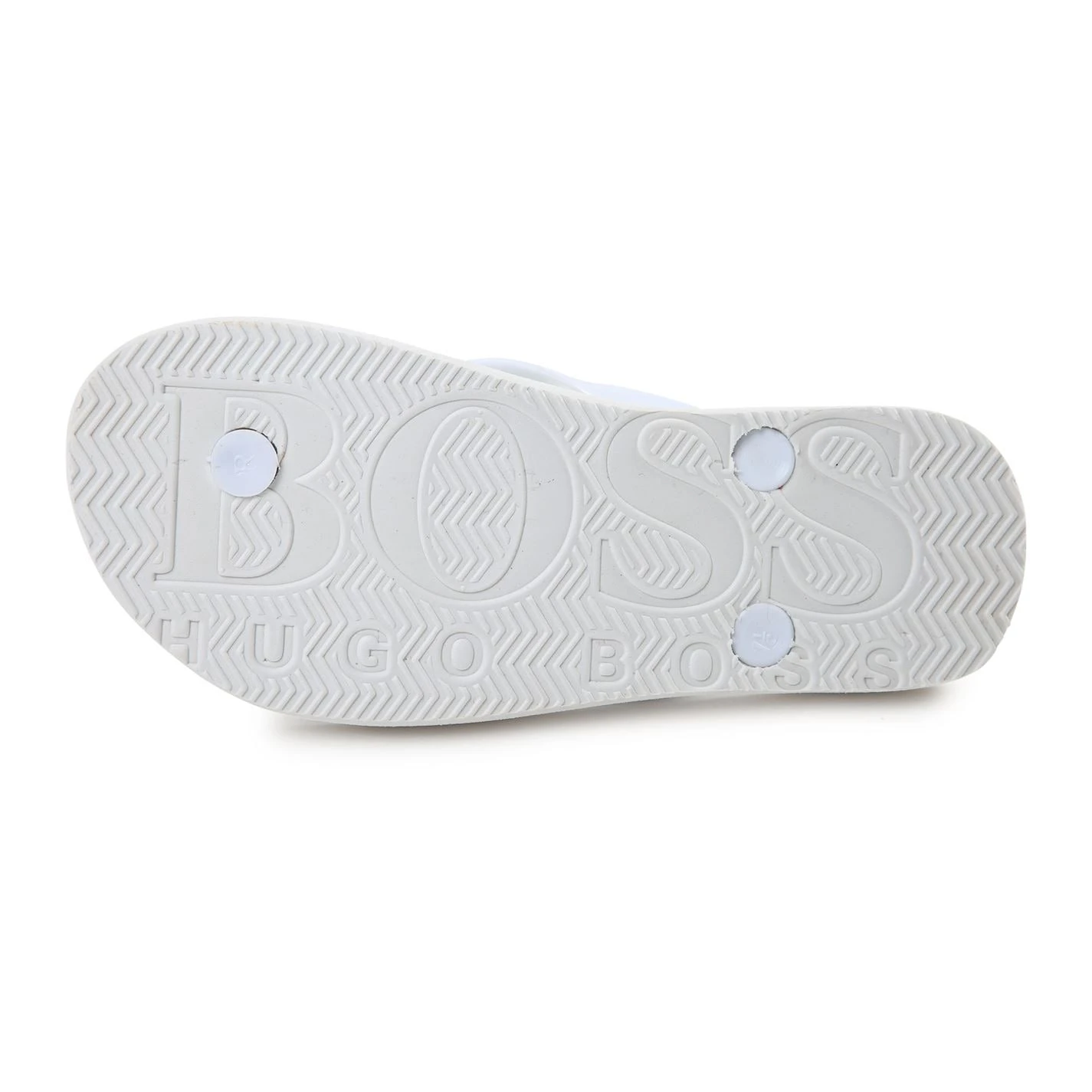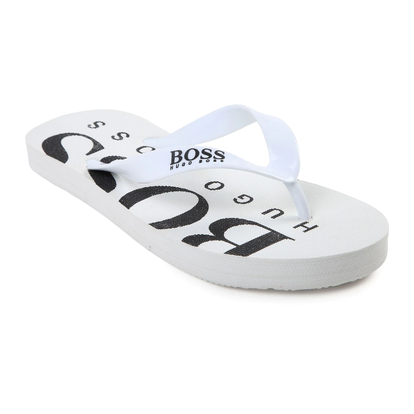 EVA flip flops, flexible sole, color contrasted logo print on sole top, tone on tone embossed logo print undersole.