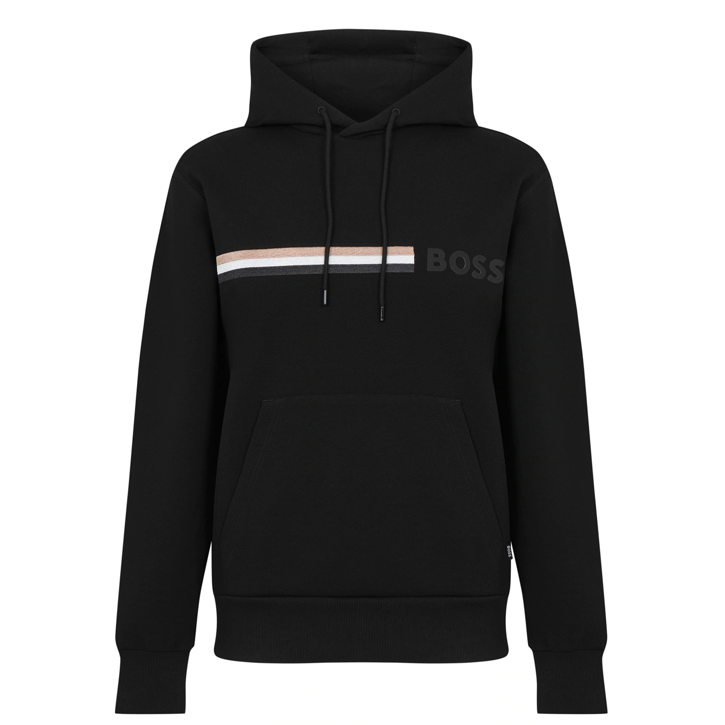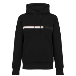 With a casual styling, this hoodie boasts a pull over construction that has been crafted from a soft cotton fabrication cut in a regular fit silhouette for a relaxed fit. Boasting a staple colourway with tonal trims to the drawcord hooded neckline, kangaroo front pocket and ribbed trims to the cuffs and straight hem, this garment is branded with a contrasting striped design and Boss logo printed to the chest.