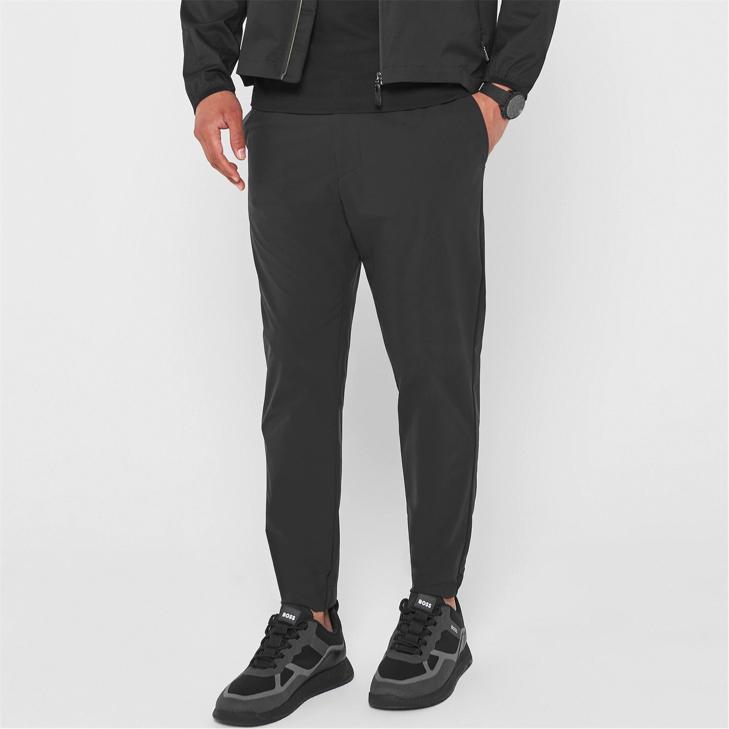 Refresh your casual attire with this versatile pair, the Shinobi Tape Trousers are crafted in a super lightweight, four-way stretch design that offering comfort to last all-day. The trousers feature an elasticated waistband with drawstring fastening to adjust the fit, a zip fly, two hand pockets with a internal zip pocket to keep your sunglasses safe, a zip back pocket, mesh pocket lining and elasticated ankle cuffs. The look is completed by the iconic BOSS logo embossed to the back for subtle appeal.